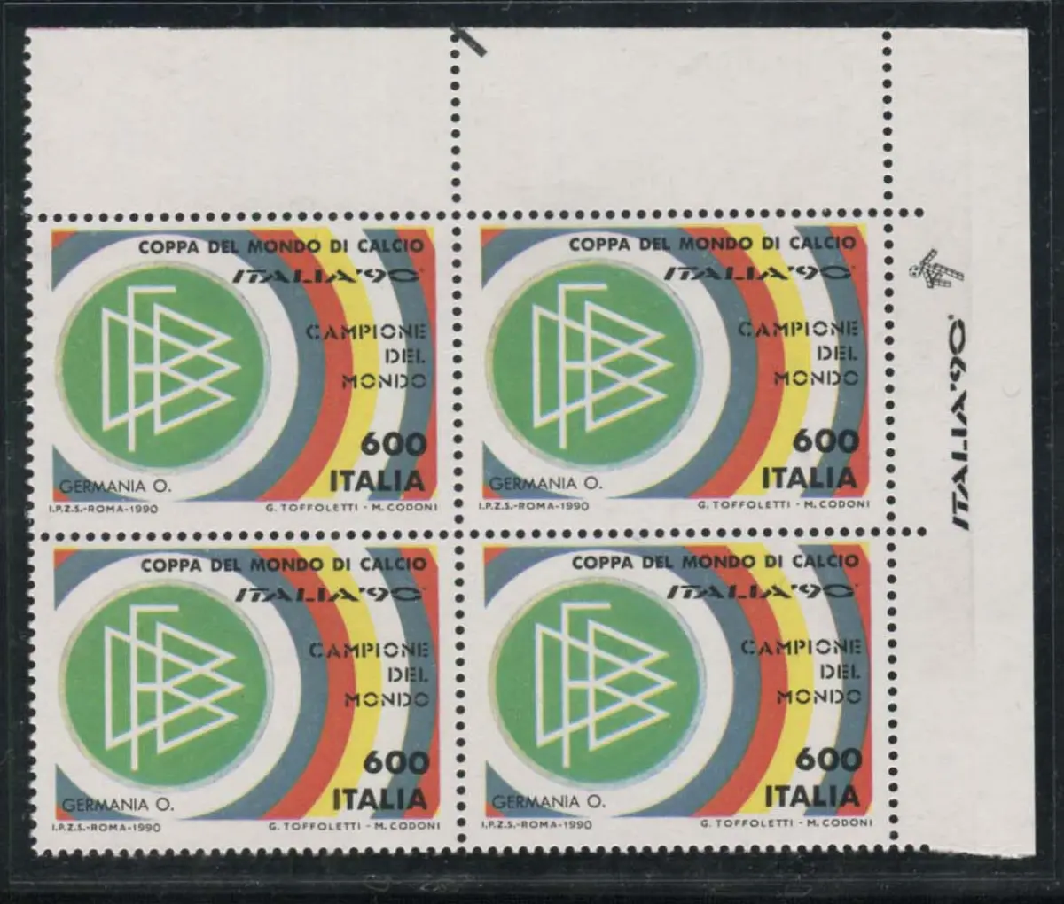 Fußball Italien '90 Viertel a. von f. oben rechts mit Aufdruck des Maskottchens Gomma Integra - Calcio Italia '90 Nr. 1942 Viertel a. von f. oben rechts mit Aufdruck des Maskottchens Ciao Italia 90 am Rand Code 284/7