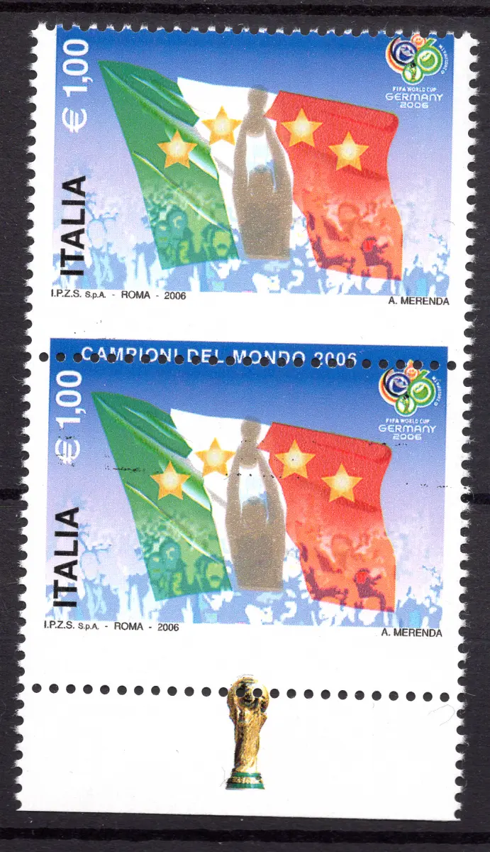 Fußball Italien Meister Nr. 2924 Paar unterer Blattrand mit Pokalanhang, der die stark vertikal verschobene Verzahnung aufweist, so dass der Schriftzug Weltmeister 2006 unten statt oben ist, das untere Exemplar ist ohne diesen Schriftzug - nur ein Exemplar des Zettels hat das Band mit Pokal und hat keinen Schriftzug oben Cod. 194/WEB