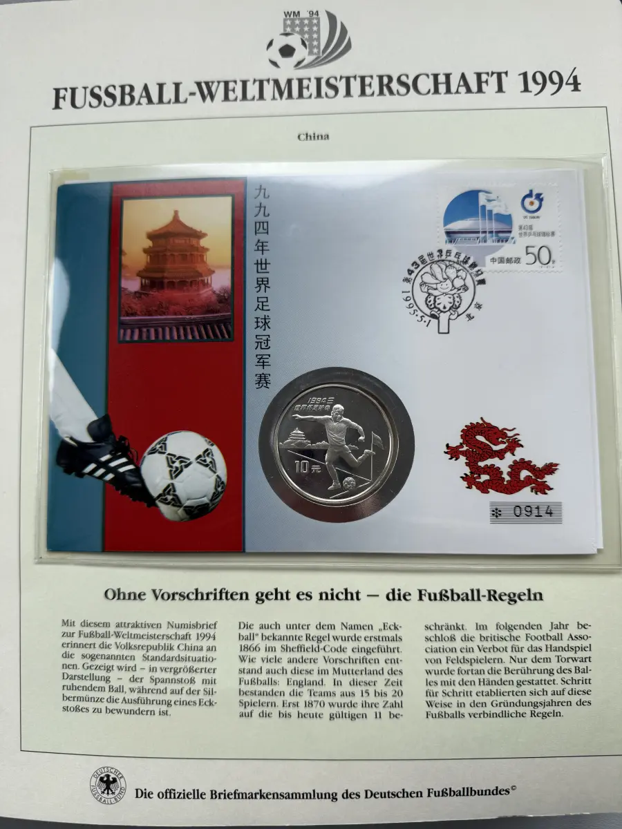 Fußball-WM 1994 USA - Numisbrief WM China, Silber 925, 27g