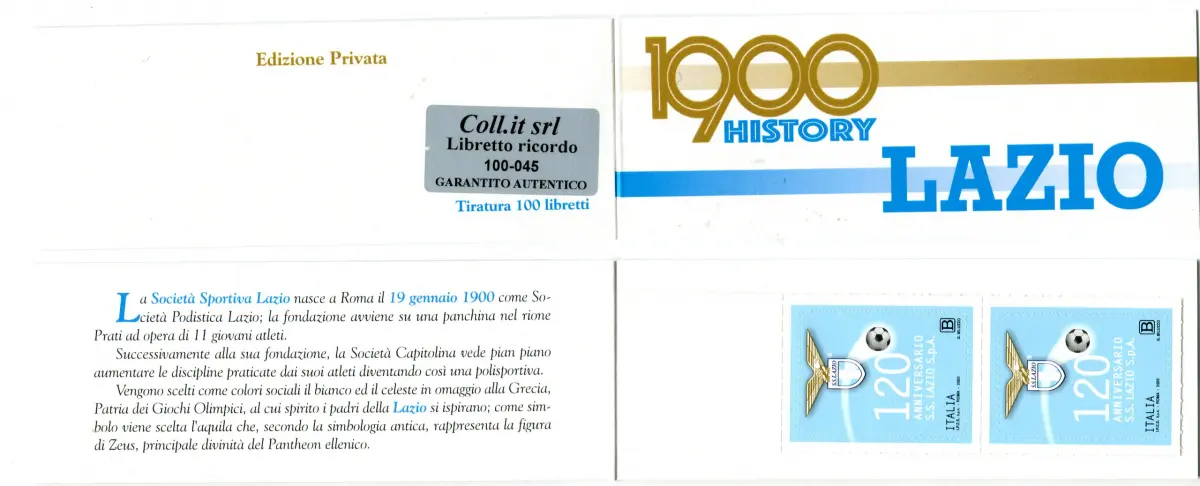 Libretto carnet Lazio 2020 - Private Ausgabe nummeriert 76 Exemplare - Calcio Libretto private Ausgabe nummeriert von nur 100 Exemplaren, enthält ein vertikales Paar der von Poste Italiane ausgegebenen Briefmarke - Auf der Rückseite Etikett VOID Anti-Fälschung mit der Nummer - Nummerierung 1 bis 24 enthält Paar Bogenrand mit Barcode, Nummer 25 bis 100 enthält Paar Blattrand - VERSAND ERFOLGT EIN BROSCHÜRE MIT DER NUMMER 25 BIS 100 - Einheitlicher Katalog Nr. 1/20