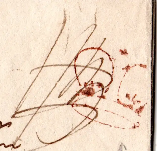 Faltbrief v. Dublin m. kpl. Inhalt n. London. Urprünglich angeschriebenes Porto 1/3 Sh. gestrichen, dies m. rotem Kronenstpl. bestätigt und korrigiert zu Porto 2/6 Sh.