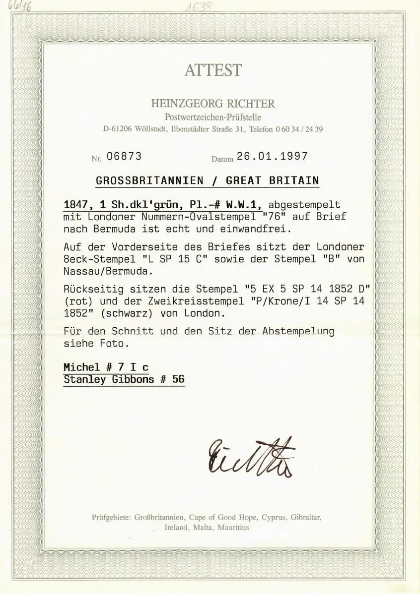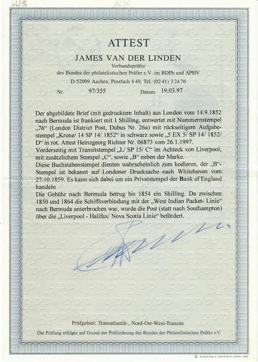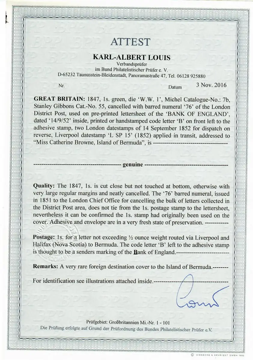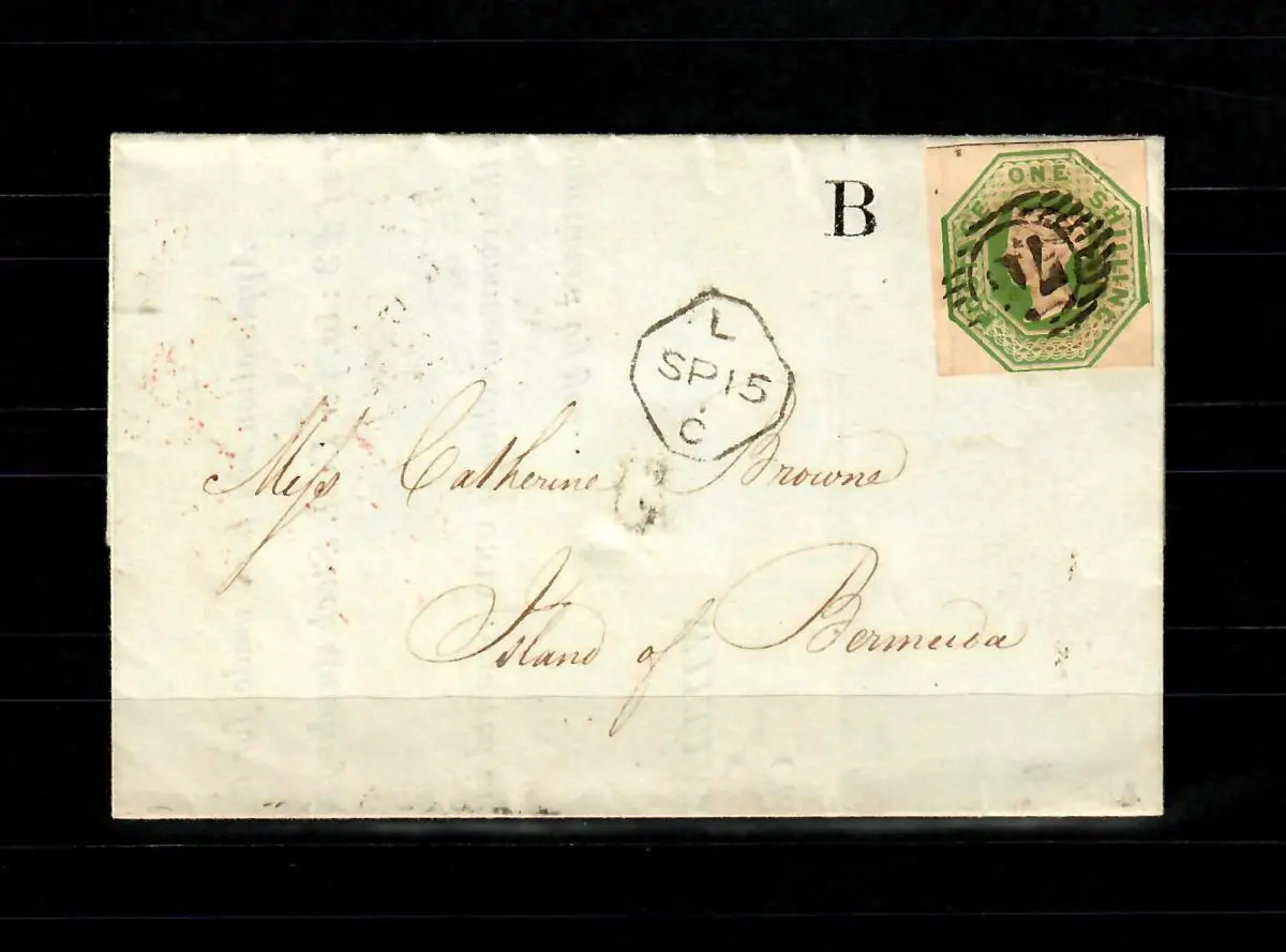 1847, 1s green, die WW1 cancelled with barred numeral 76 of the London District Post, used on pre-printed lettersheet of the Bank of England, dated 14.9.1852 inside, printed or handstamped letter code B on the front left to the adhesive stamp, two London date stamps of 14.9.1852 for dispatsch on reverse, Liverpool datestamp L SP 15, applied in transit, addressed to Miss Catherine Browne, Island of Bermuda.
