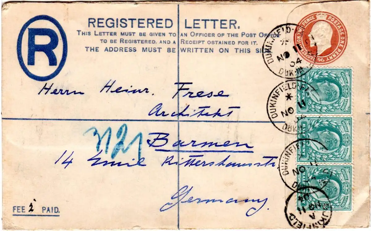 GB 1904, 3x1/2d Zusatzfr. auf 2+1d Einschreiben Ganzsachenumschlag v. Dukinfield
