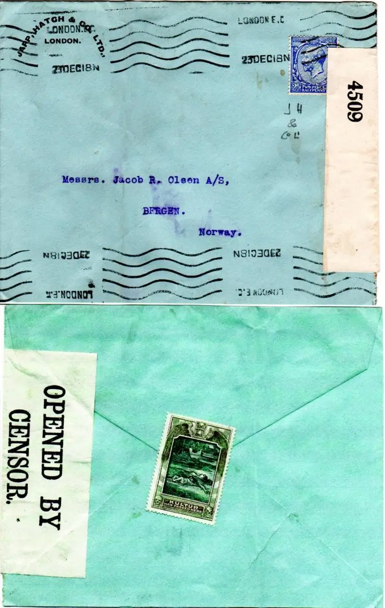 2 1/2d m. Firmenlochung JH & Co Ld auf Japp, Hatch & Co. Ltd. Firmenumschlag v. London n. Bergen, Norwegen. Rückseitig Vignette Kulture Has Passed Here m. Abb. von Leichen u. 2 Totenköpfen. Umschlag m. senkr. Faltspur links, siehe scan.