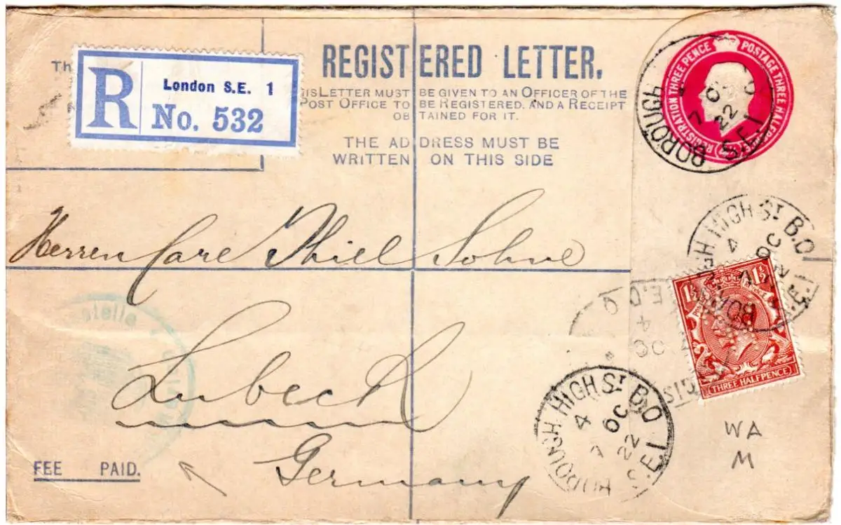 1 1/2d m. Firmenlochung WA M auf Reko GaU v. London Borough High St. n. Lübeck m. dt. Emmerich Zensur..