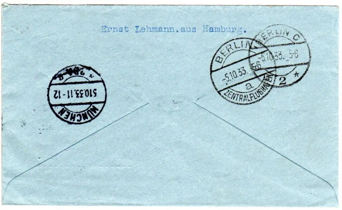 Luftpostbrief v. London über Berlin n. München. Diverse Stempel rückseitig.