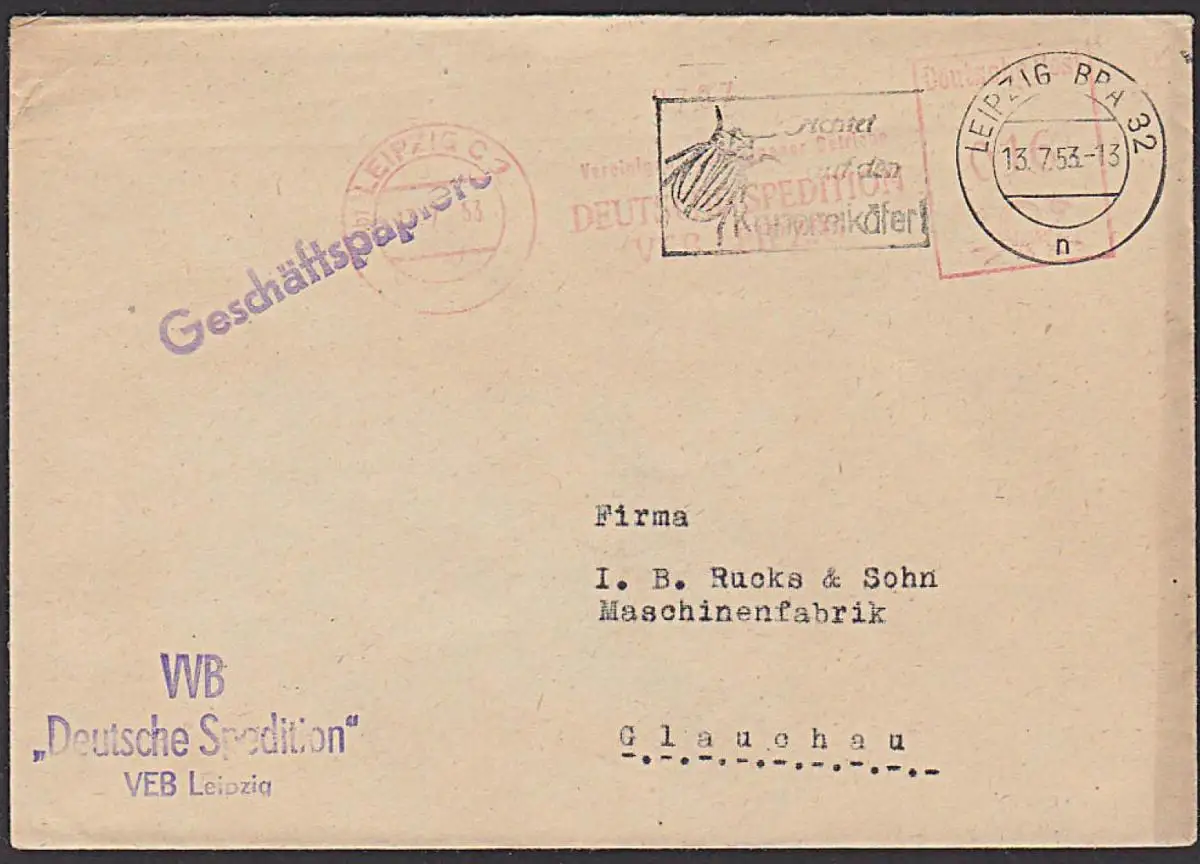GDR potato beetle Kartoffelkäfer Cover with AFS LEIPZIG and MWSt. 1953 Abs. VVB "Deutsche Spedition"