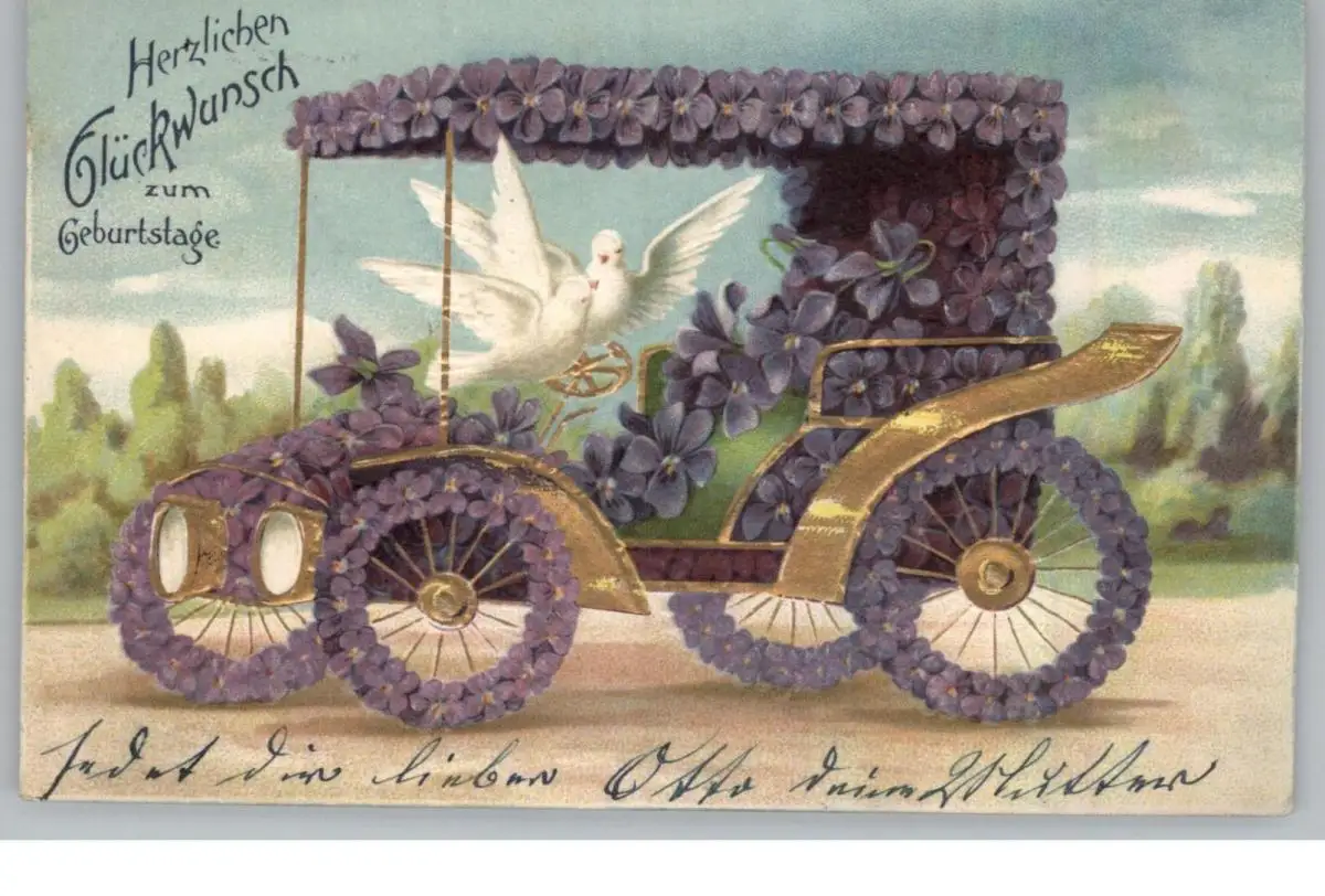 GEBURTSTAG - Oldtimer im Blumenschmuck, Tauben, Präge-Karte / embossed / relief, 1906