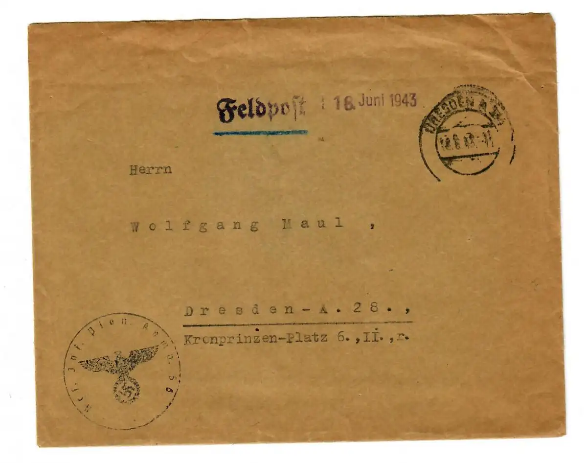 GG 1943 Feldpost Brief Jaroslau Pi. - Kp. 56 nach Dresden, nachgestempelt