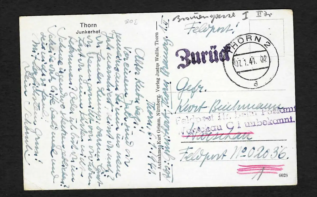 GG: AK Thorn als Feldpost nach Warschau, FeldpostNr. in Warschau unbekannt 1941