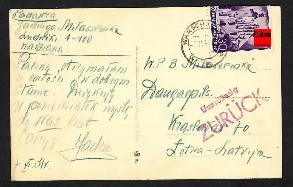 GG: Ansichtskarte Warschau nach Lettland 7.6.41, unzulässig zurück