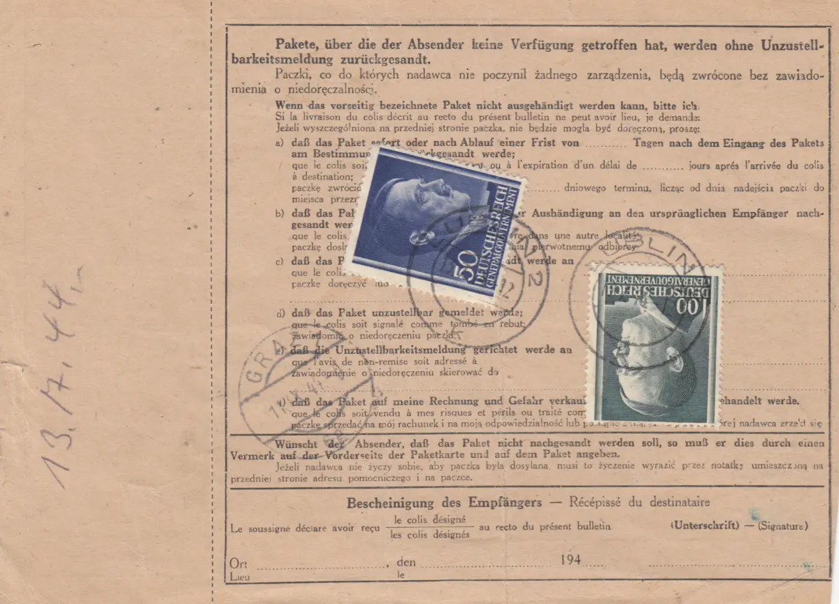 GG Auslandspaketkarte Lublin nach Wolfsdorf, FPNr. 59483c Marke oben beschnitten