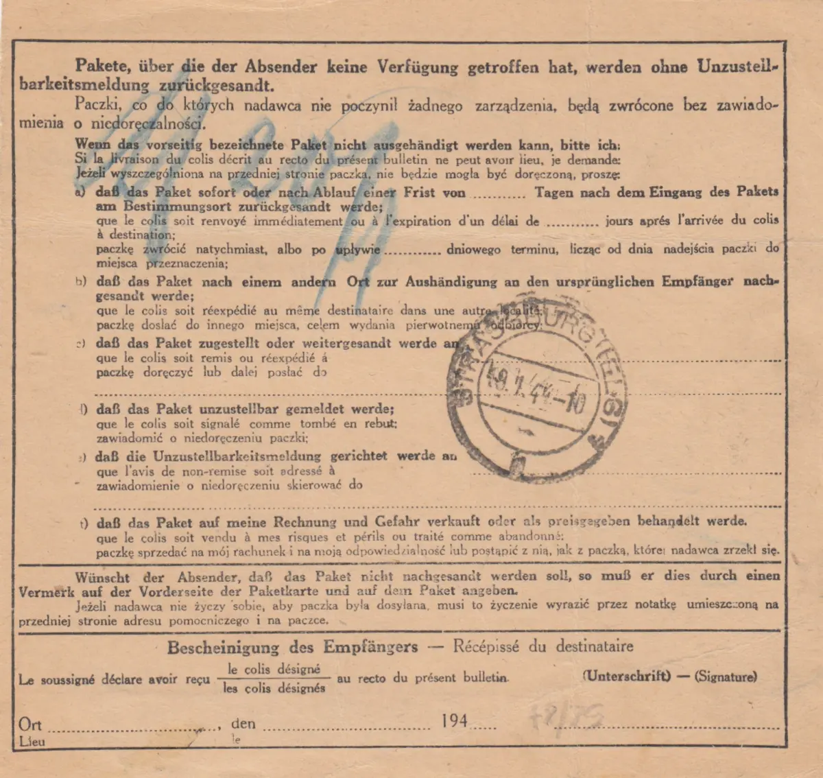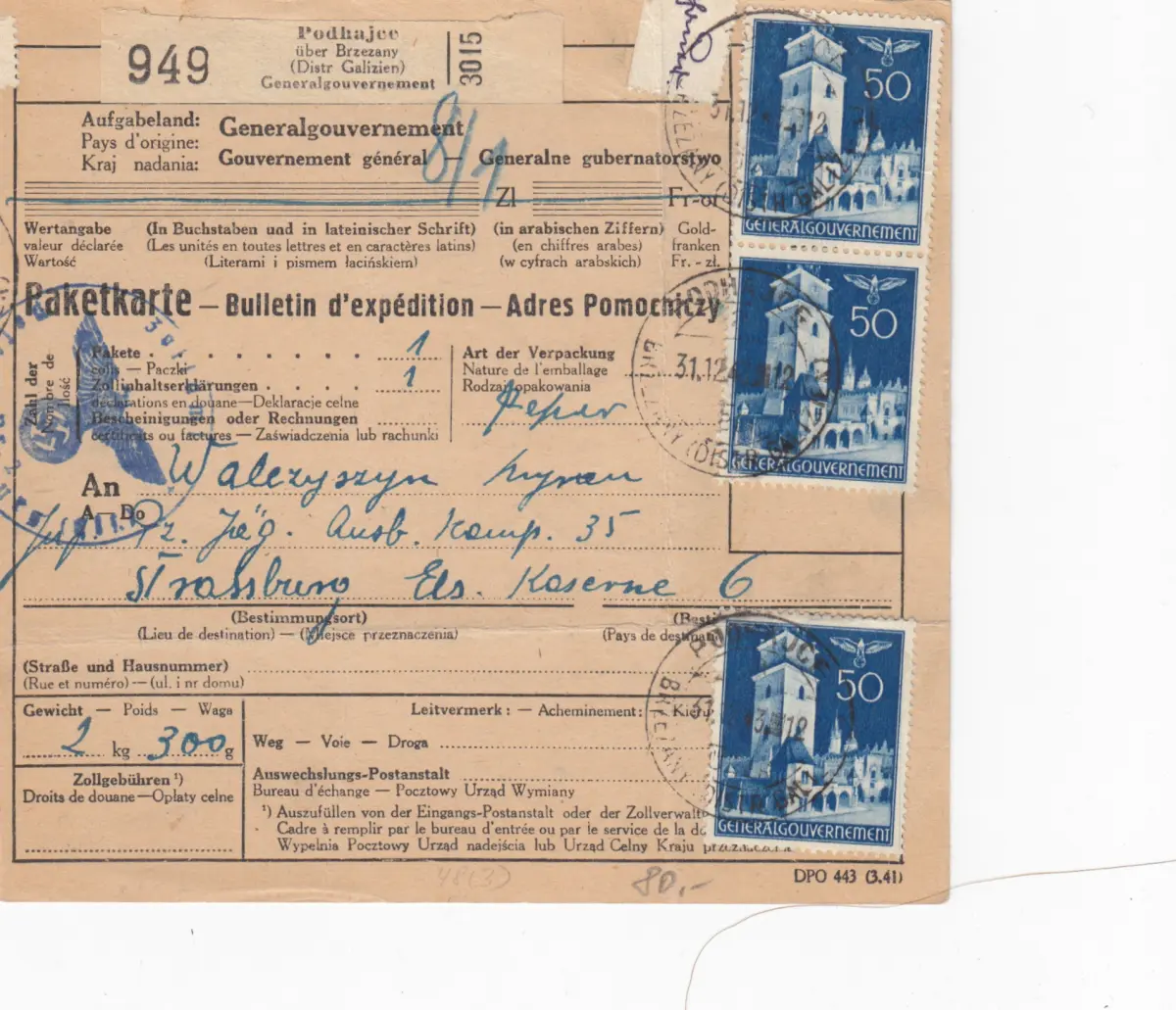 GG: Auslandspaketkarte Podhajce nach Strassburg, SS-Freiw. Div. Galizien, Pz. Jäger