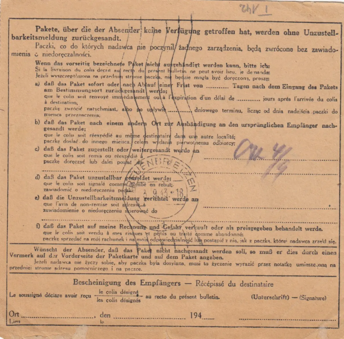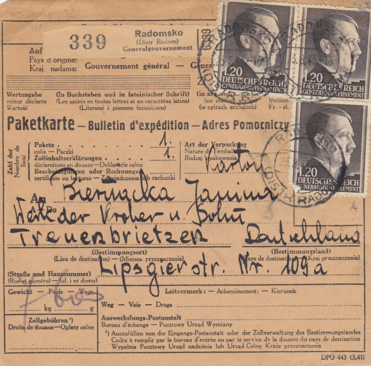 GG: Auslandspaketkarte Radomsko - Treuenbrietzen, MiNr. 87A, MeF