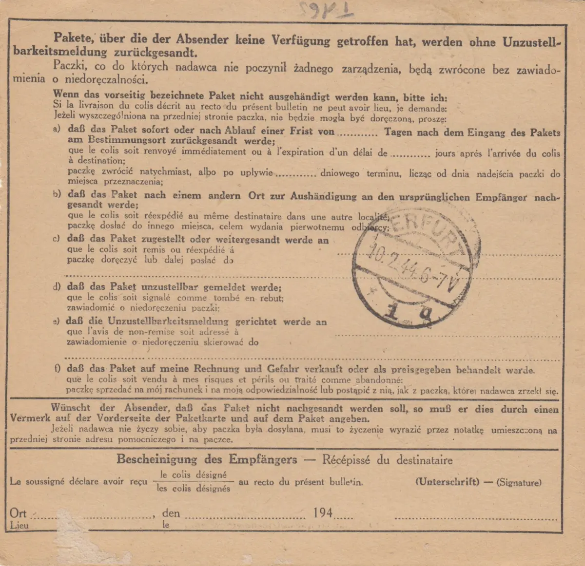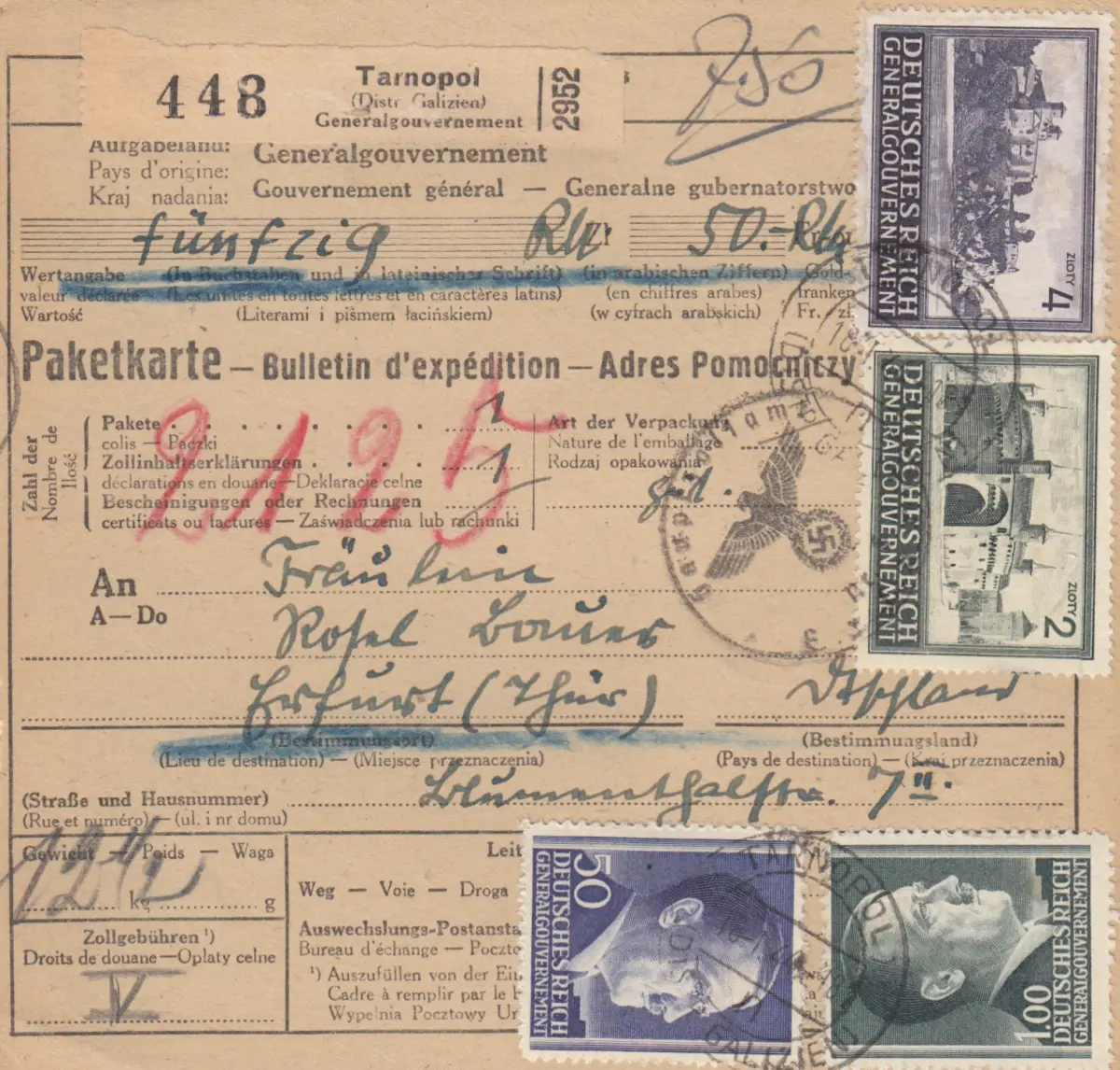 GG Auslandspaketkarte Tarnopol nach Erfurt - Arbeitslager