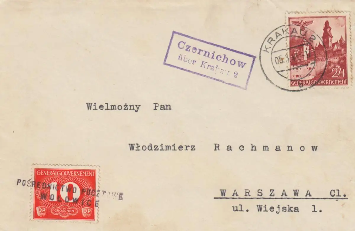 GG: Brief Czernichow nach Warschau, Vorderseite, portogerechte Entwertung der Z1
