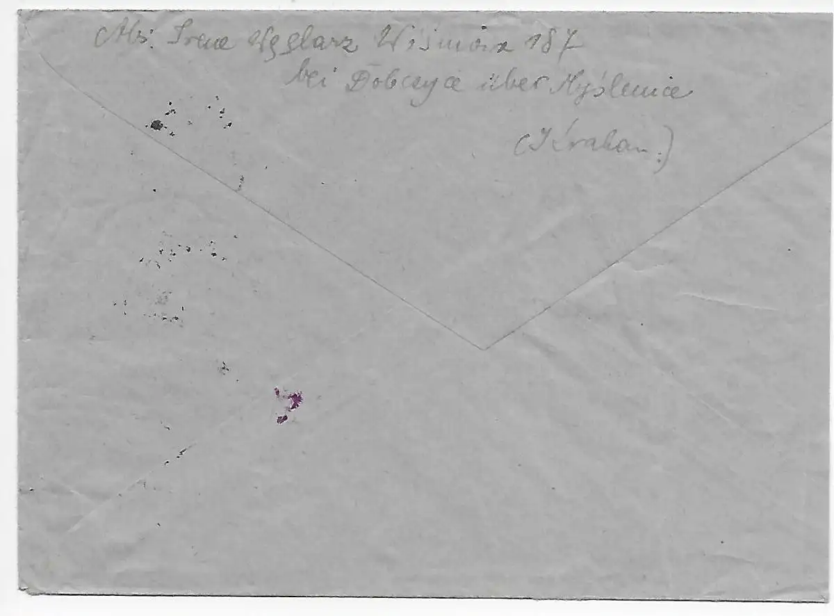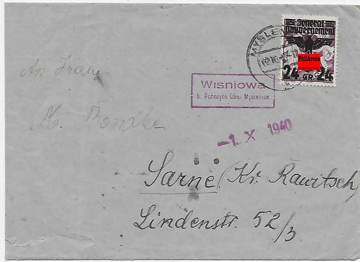 GG: Brief von Myslenice, Postagentur Wisniowa bei Pobocyce nach Sarne 1940