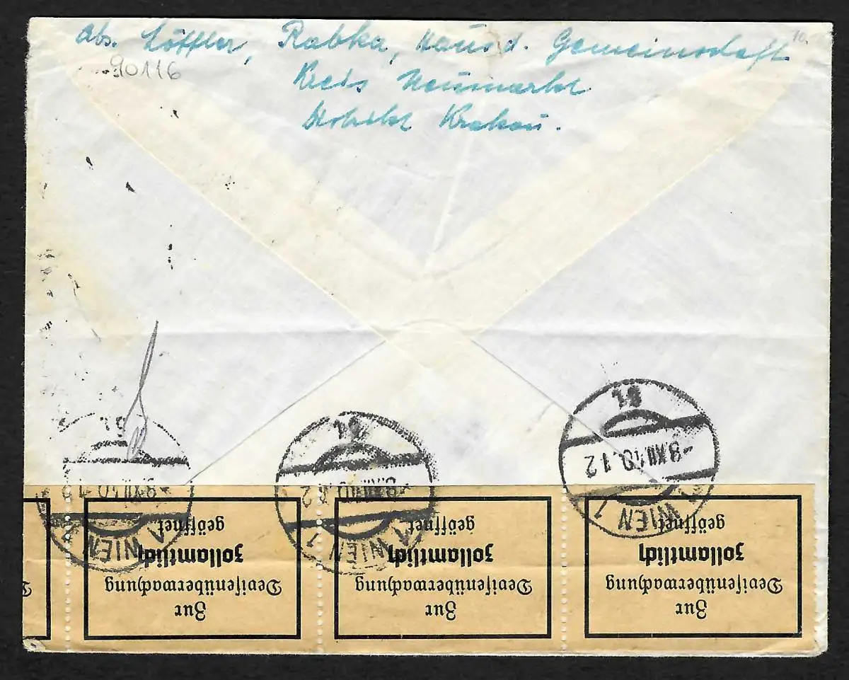 GG: Brief von Rabka nach Wien, rückseitig: Devisenüberwachung 1940