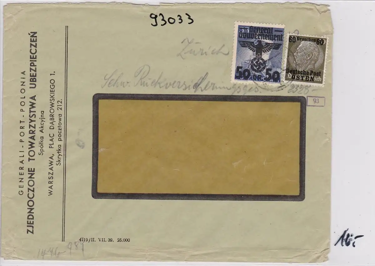 GG: Brief von Warschau nach Zürich/Schweiz- Zensur, Rückversicherung
