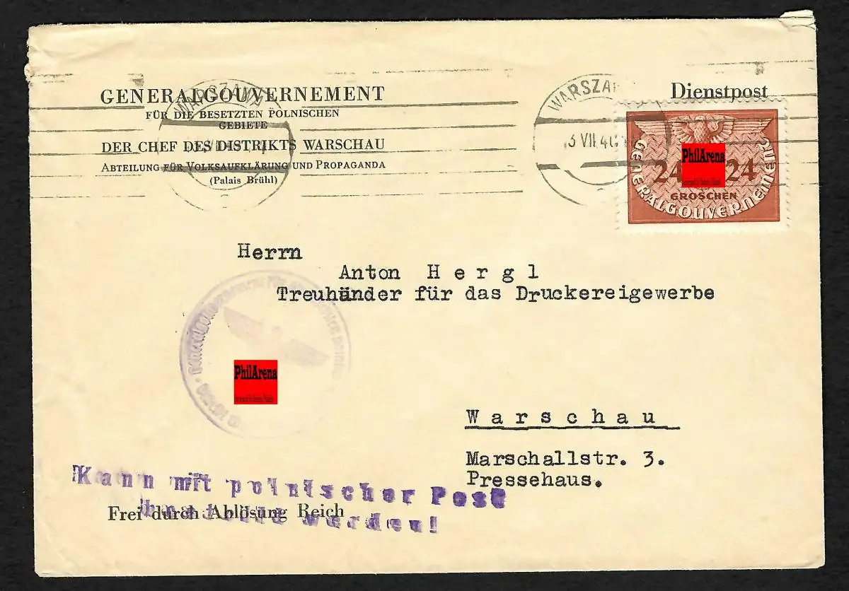 GG: Dienstbrief Chef des Distrikts Warschau: Stempel: Kann mit poln. Post ....