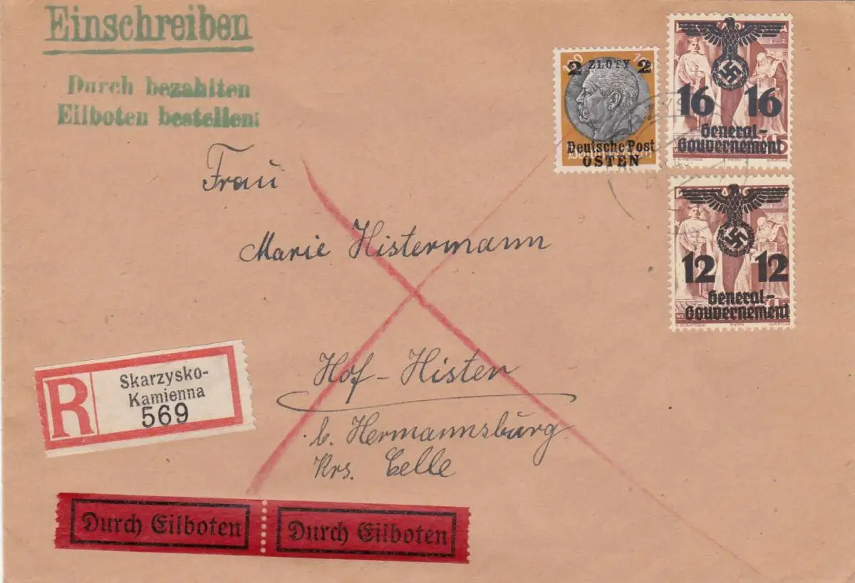 GG: Eilboten Einschreiben Skarzysko, Porto 220, leicht überfrankiert