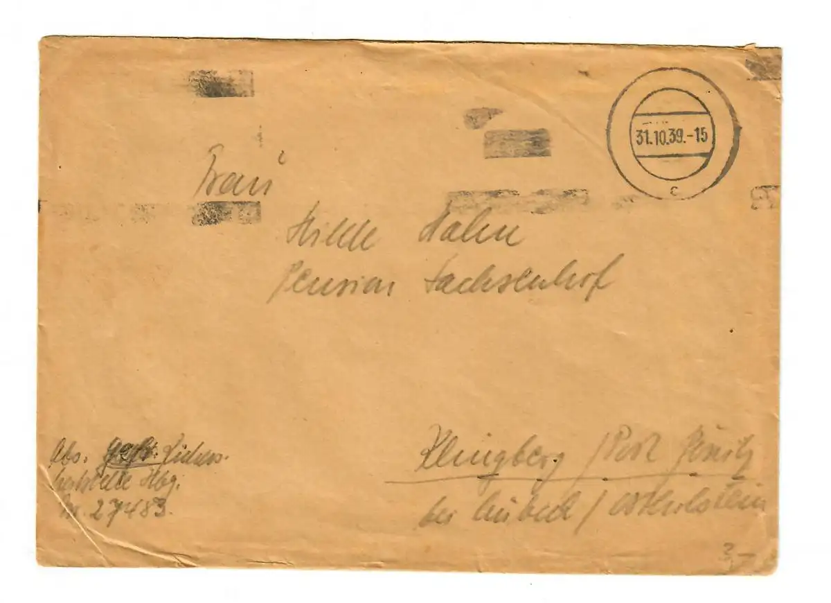 GG: Feldpost 31.10.39, FPNr. 27483, 6. Bat. Art. Reg. 56 nach Klingberg