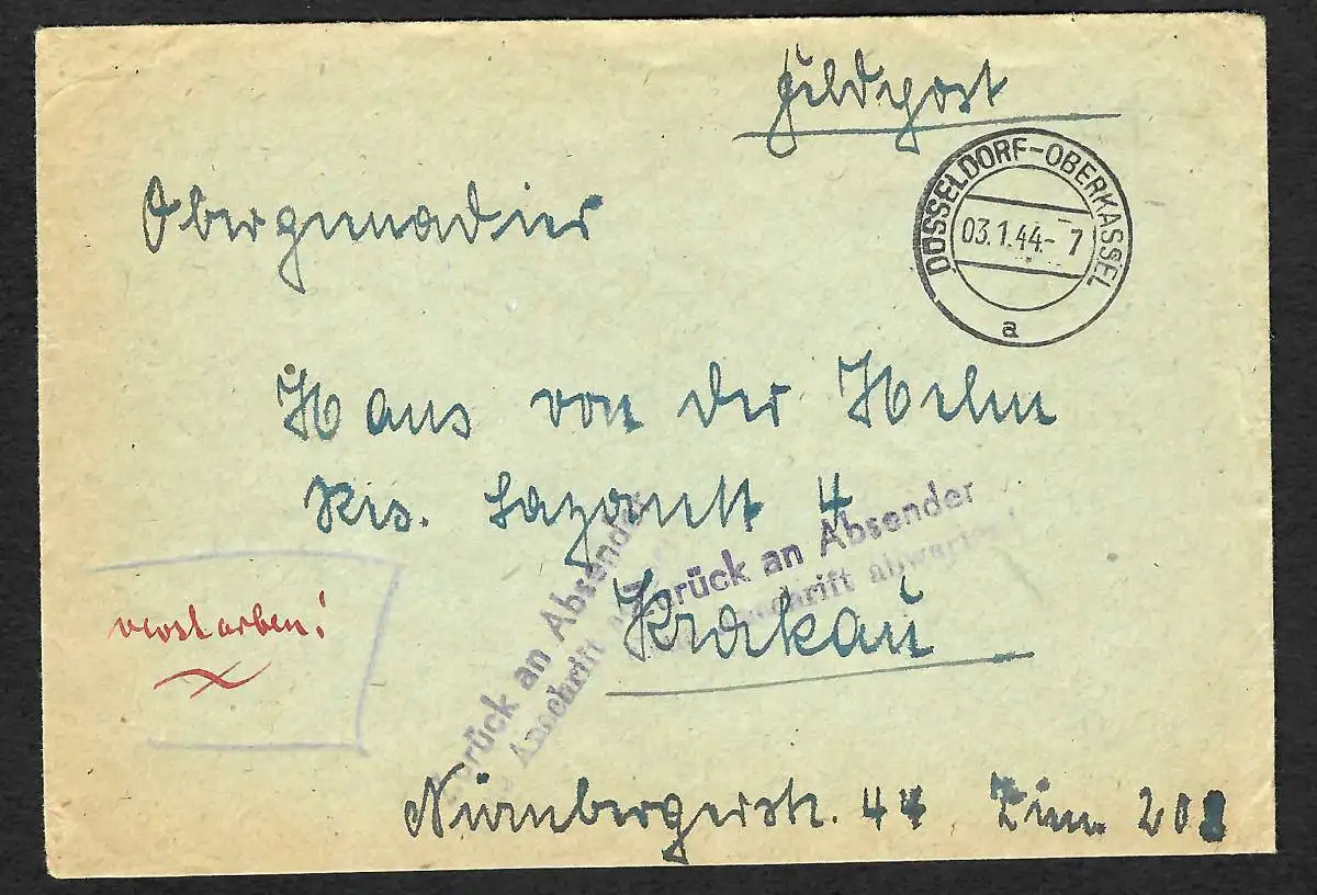 GG: Feldpost Düsseldorf 1944 an Lazarett Krakau: Zurück an Absender, verstorben