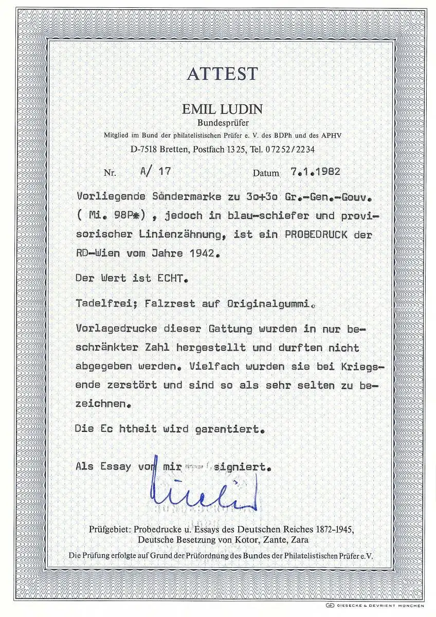 GG Generalgouvernement: Probedruck MiNr. 98 P1, Falz, mit BPP Attest