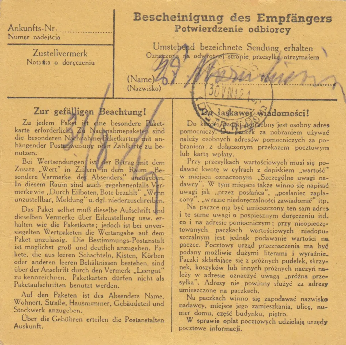 GG: Inlandspaketkarte Busko Zdroj, offener Wert nach Kielce, EF MiNr. 87A