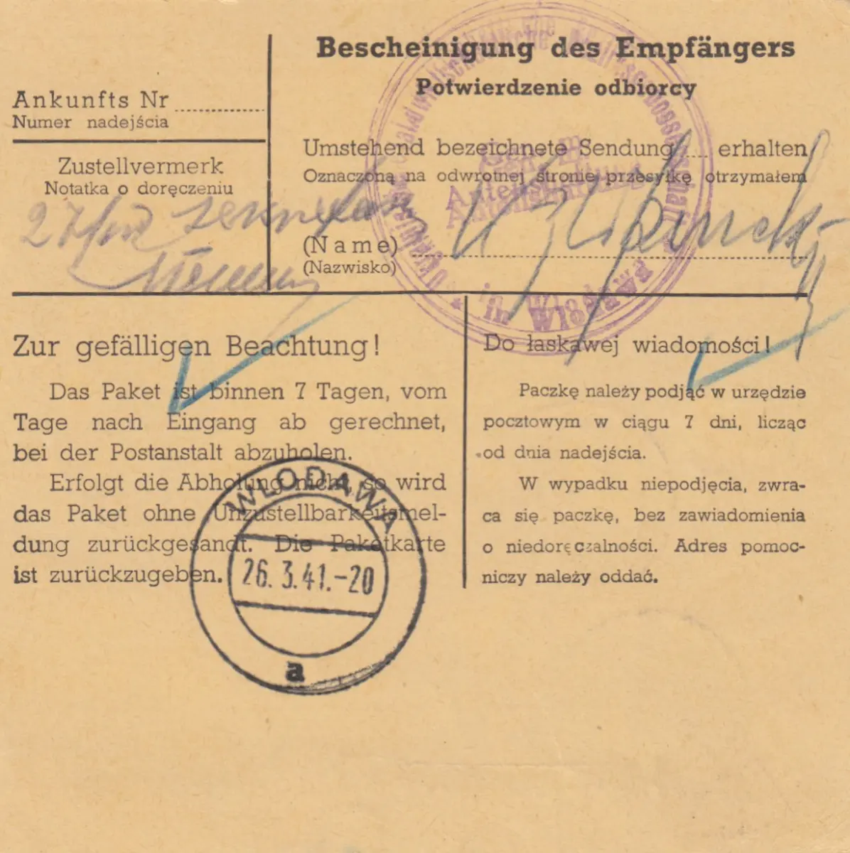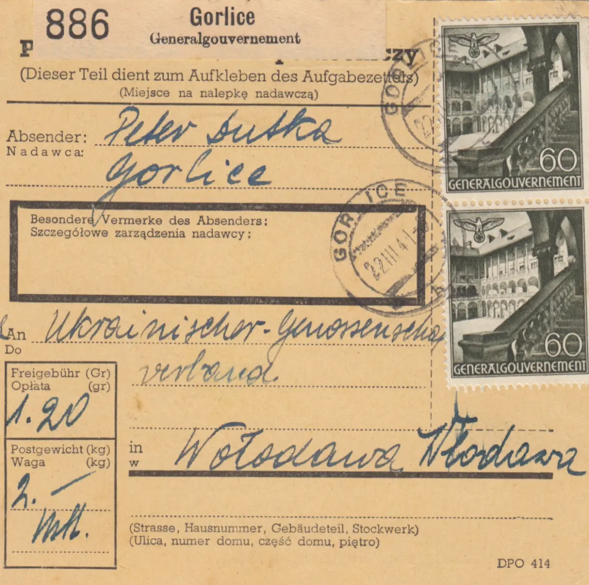 GG Inlandspaketkarte Gorlice - Wlodawa mit schöner MeF 60Gr.