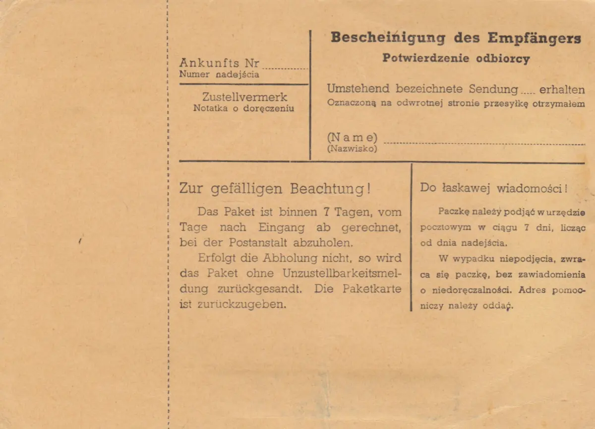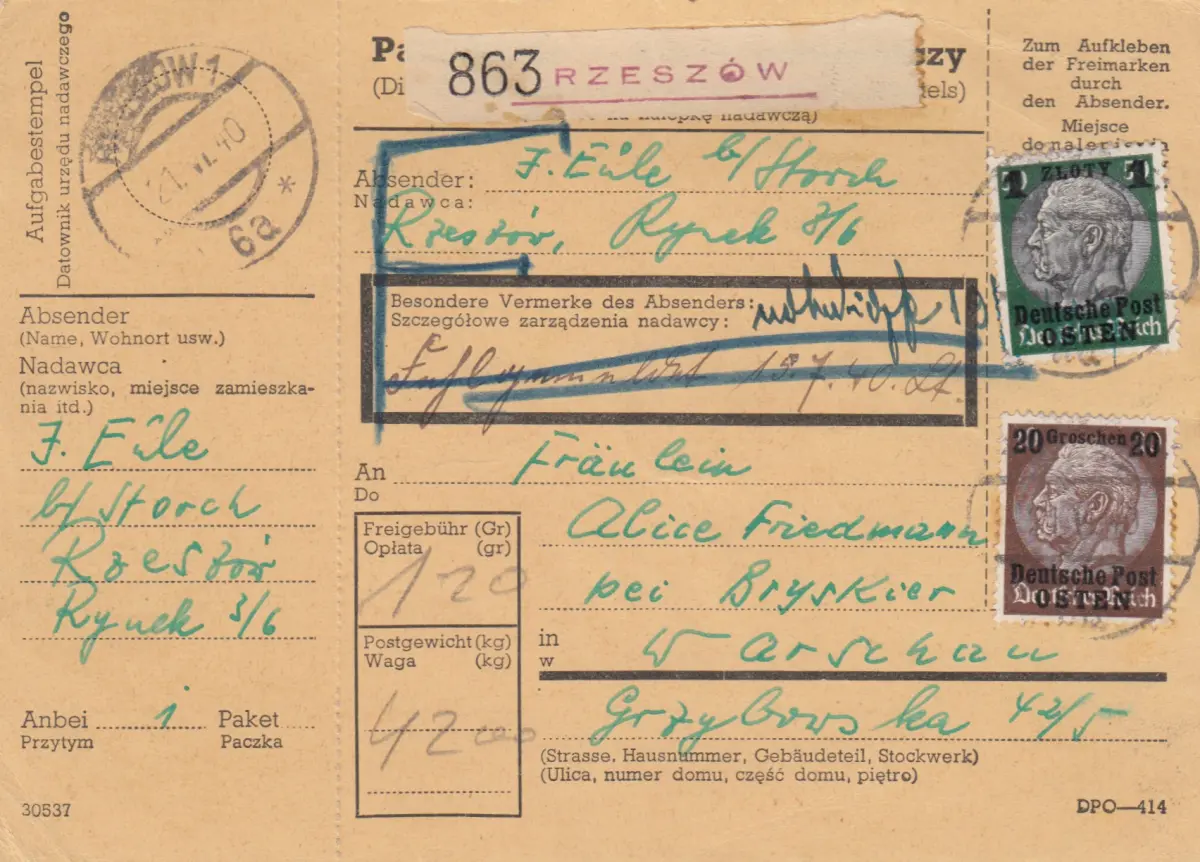 GG Inlandspaketkarte Rzeszow nach Warschau, Fehlgemeldet