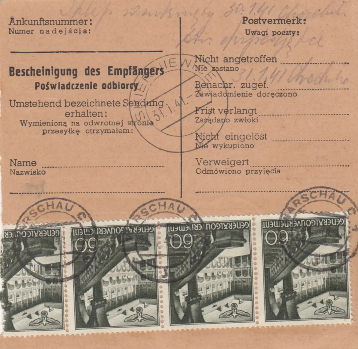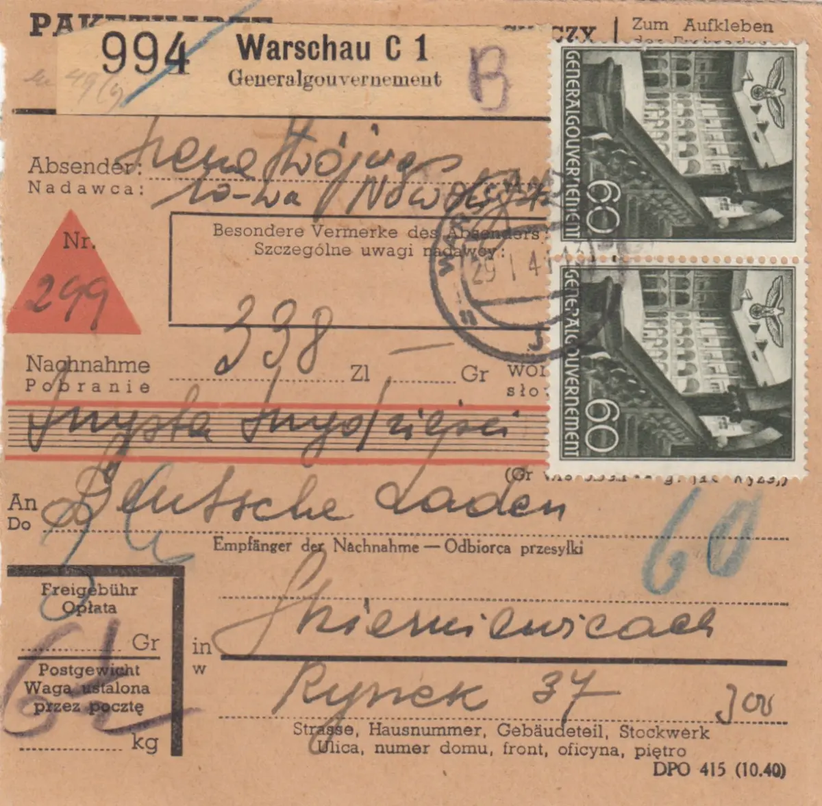 GG Inlandspaketkarte Warschau Nachnahme nach Skierniewice mit schöner 6x MeF