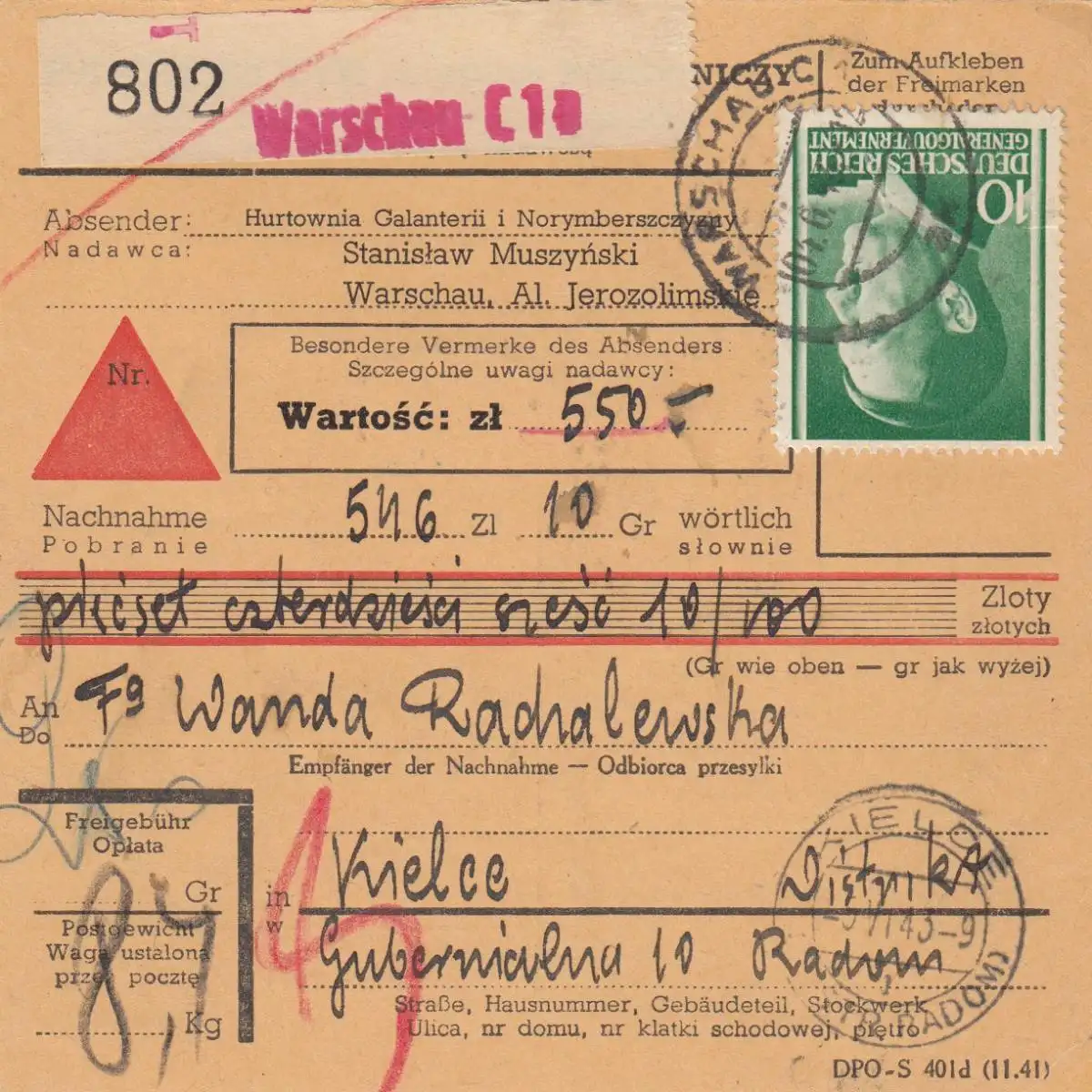 GG: Inlandspaketkarte Warschau Selbstbucher Nachnahme nach Kielce