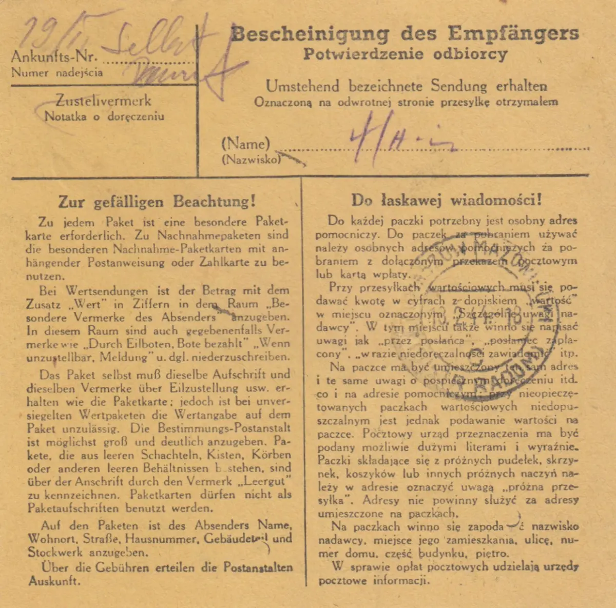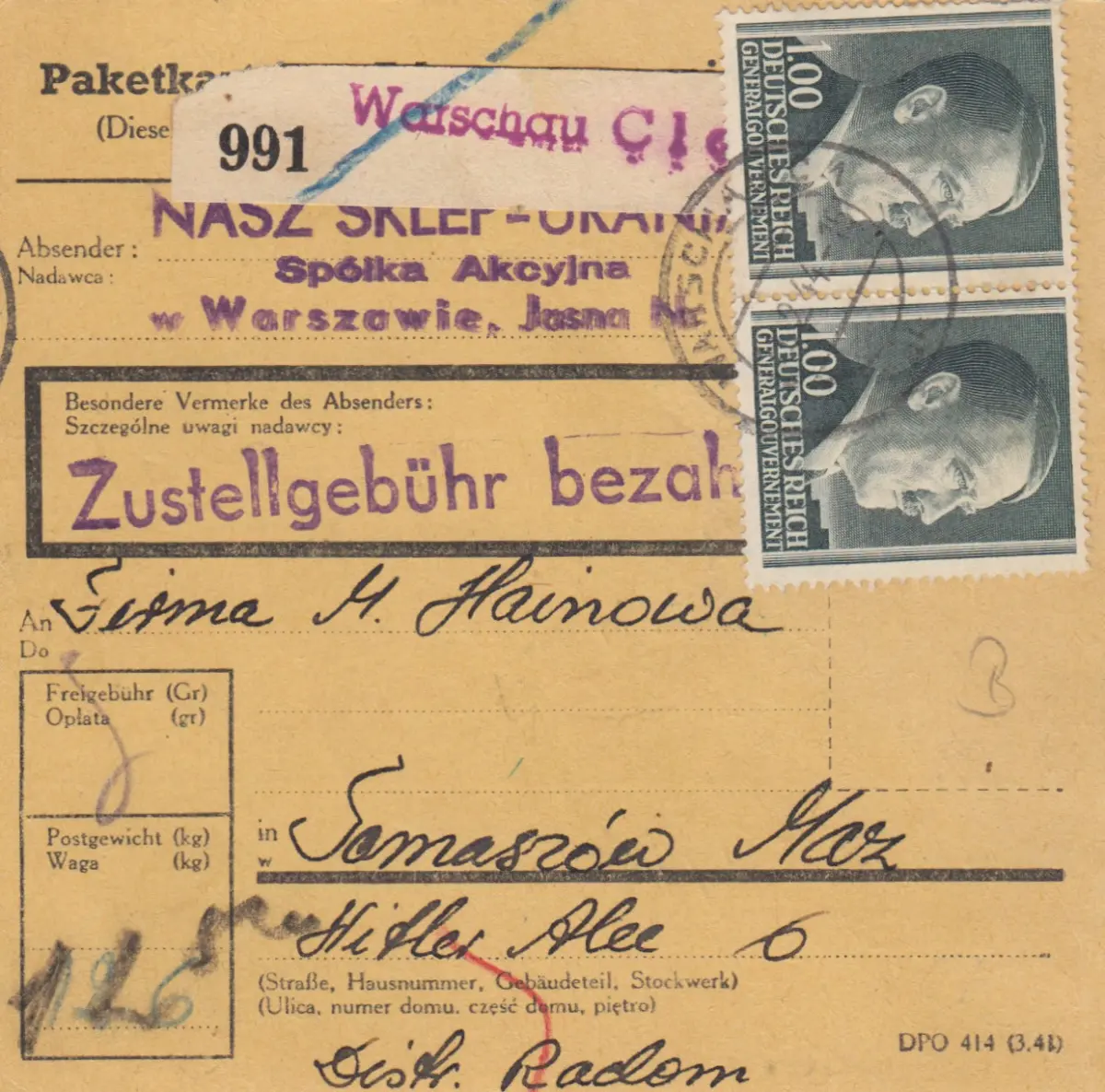 GG: Inlandspaketkarte Warschau - Tomaszow, MeF MiNr. 86B, selten