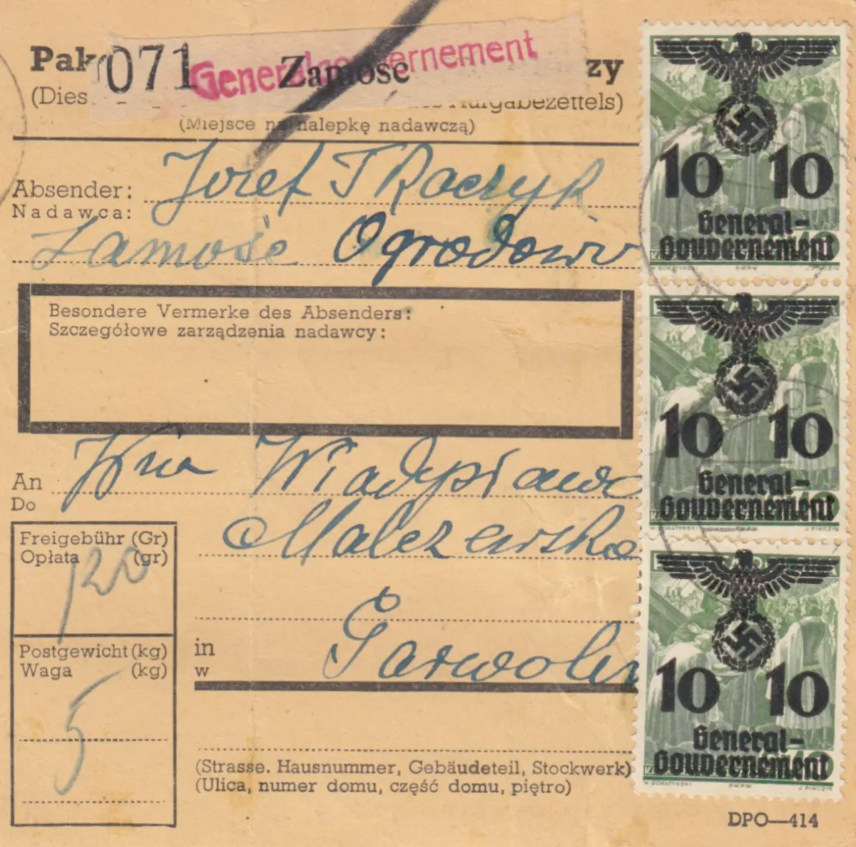 GG: Inlandspaketkarte Zamosc-Garwolin, MeF 10 Gr, Bug