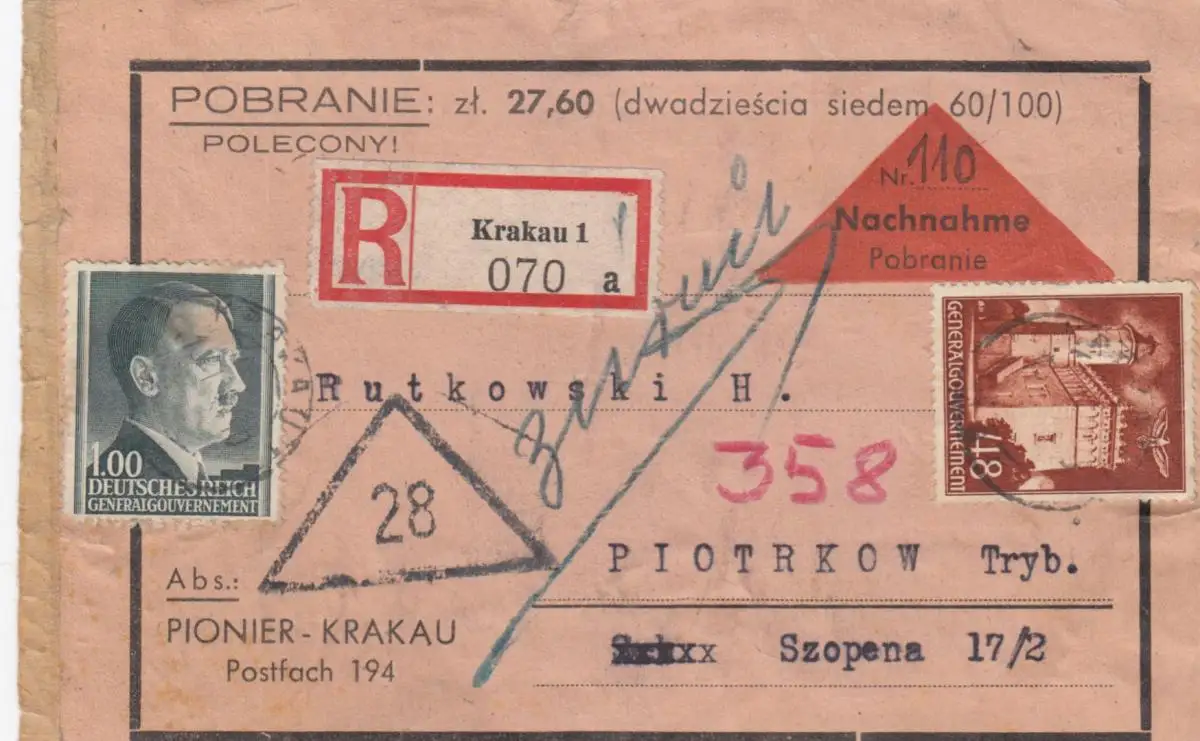 GG Nachnahme R-Briefausschnitt, portogerecht von Krakau nach Piotrkow und zurück