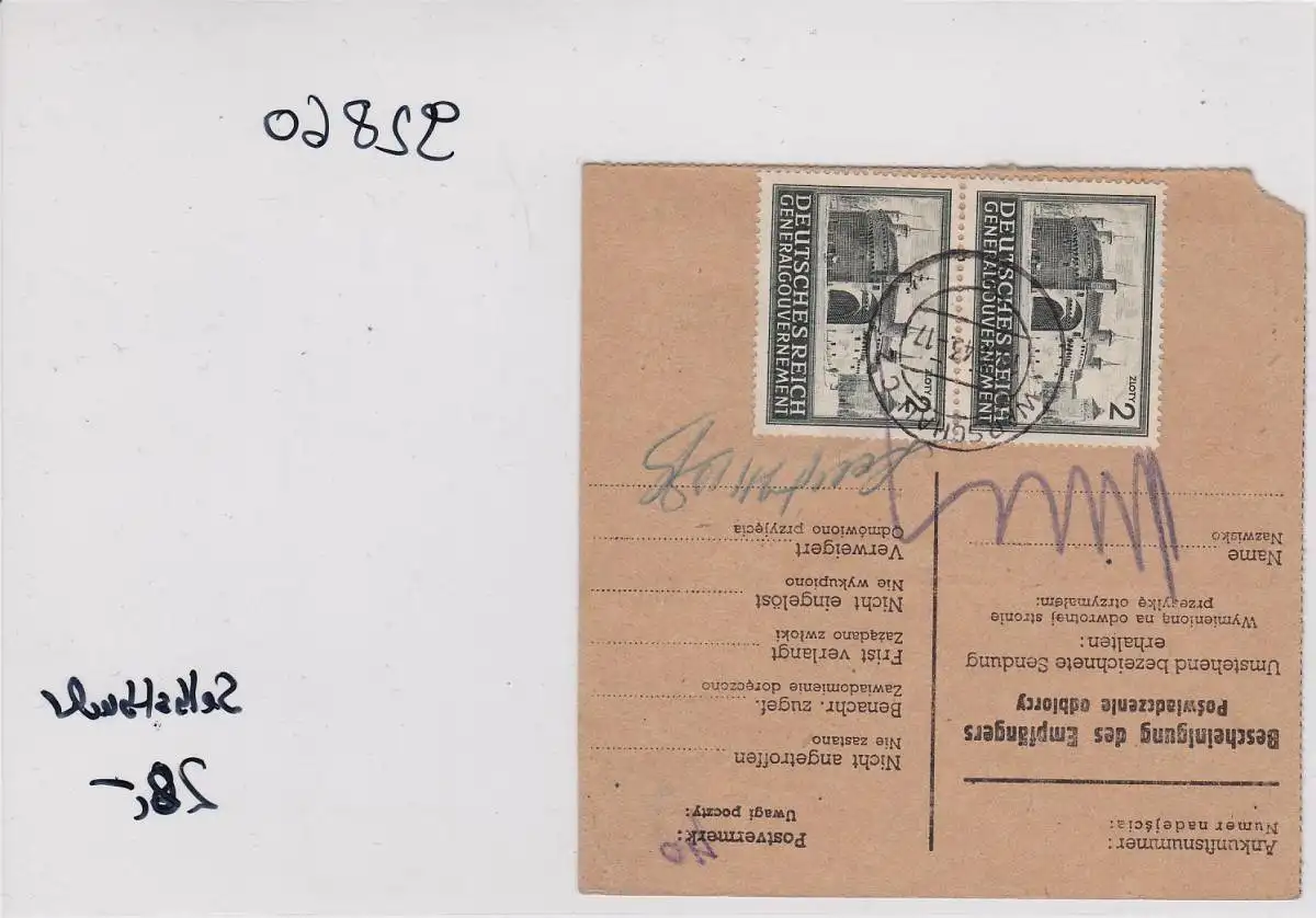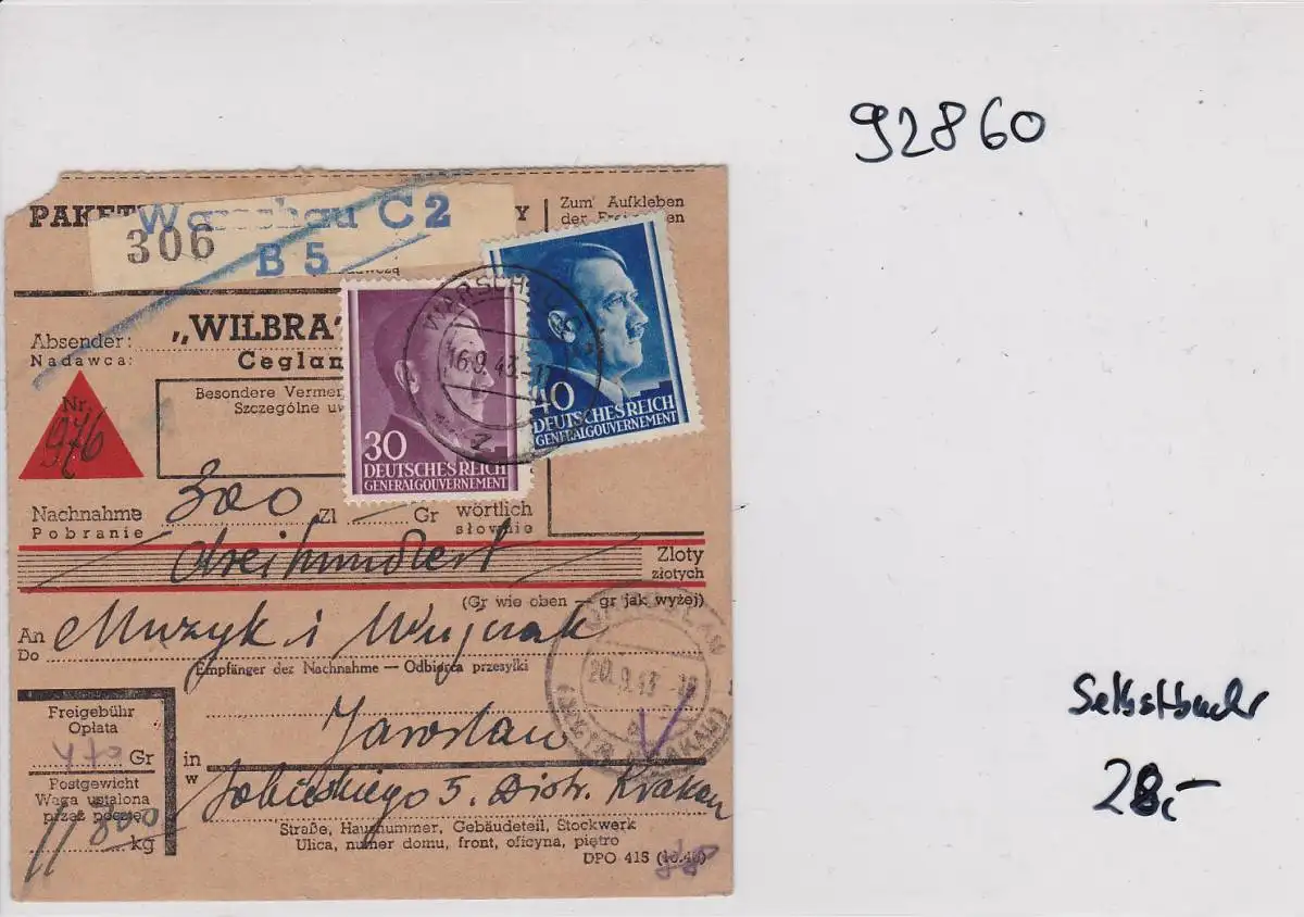 GG: Paketkarte, Warschau, Nachnahme, Selbstbucher