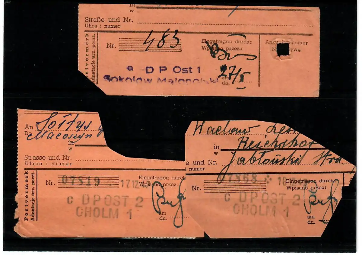 GG: Paketkartenausschnitte mit Stempeln Cholm und Sokolow