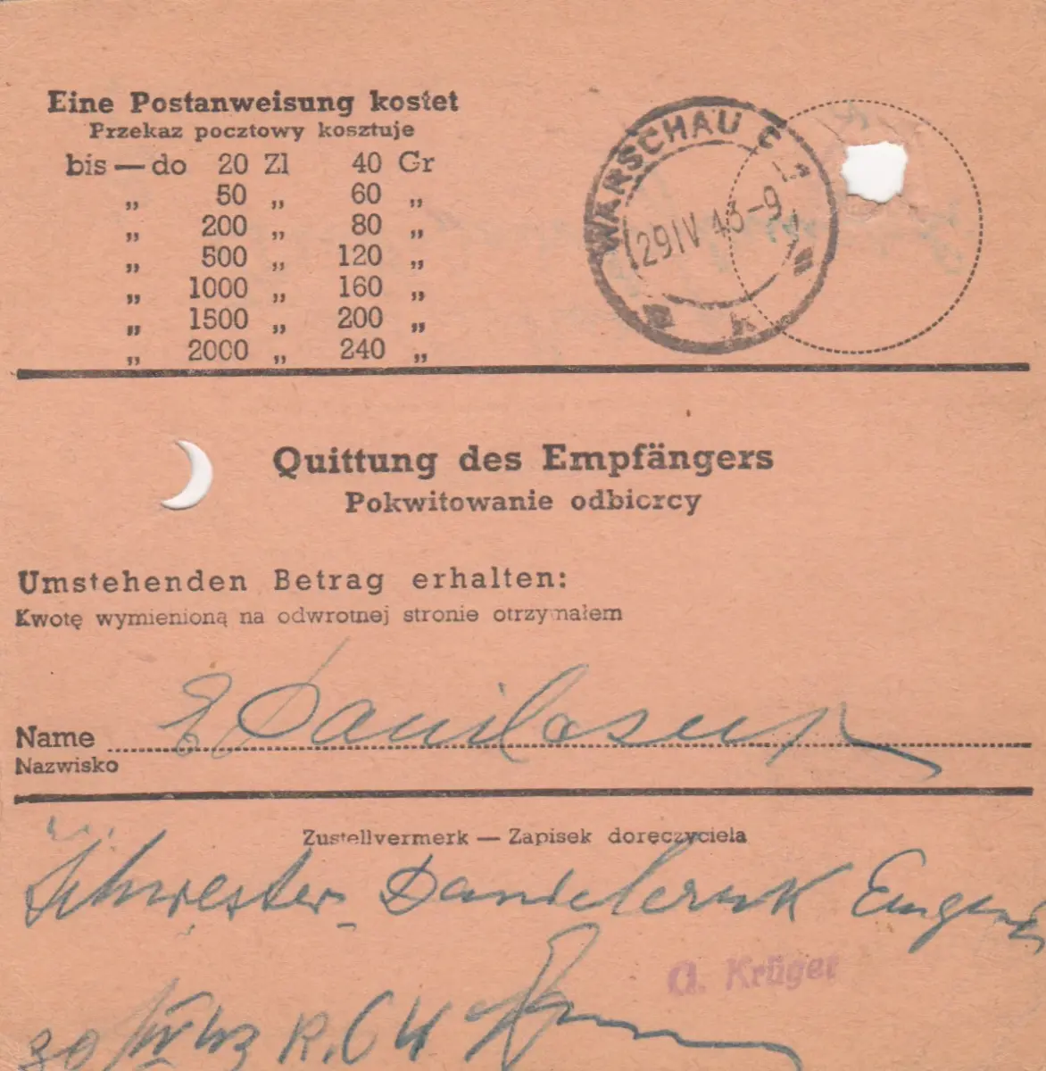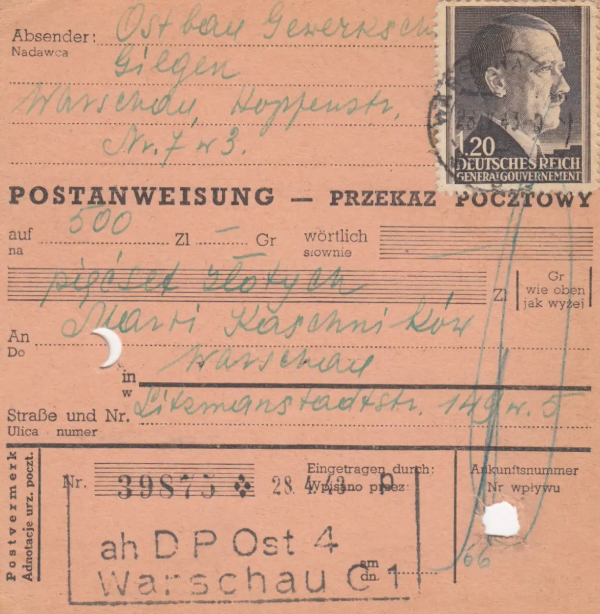 GG Postanweisung Ostbahn Warschau, DP Ost 4, EF, portogerecht
