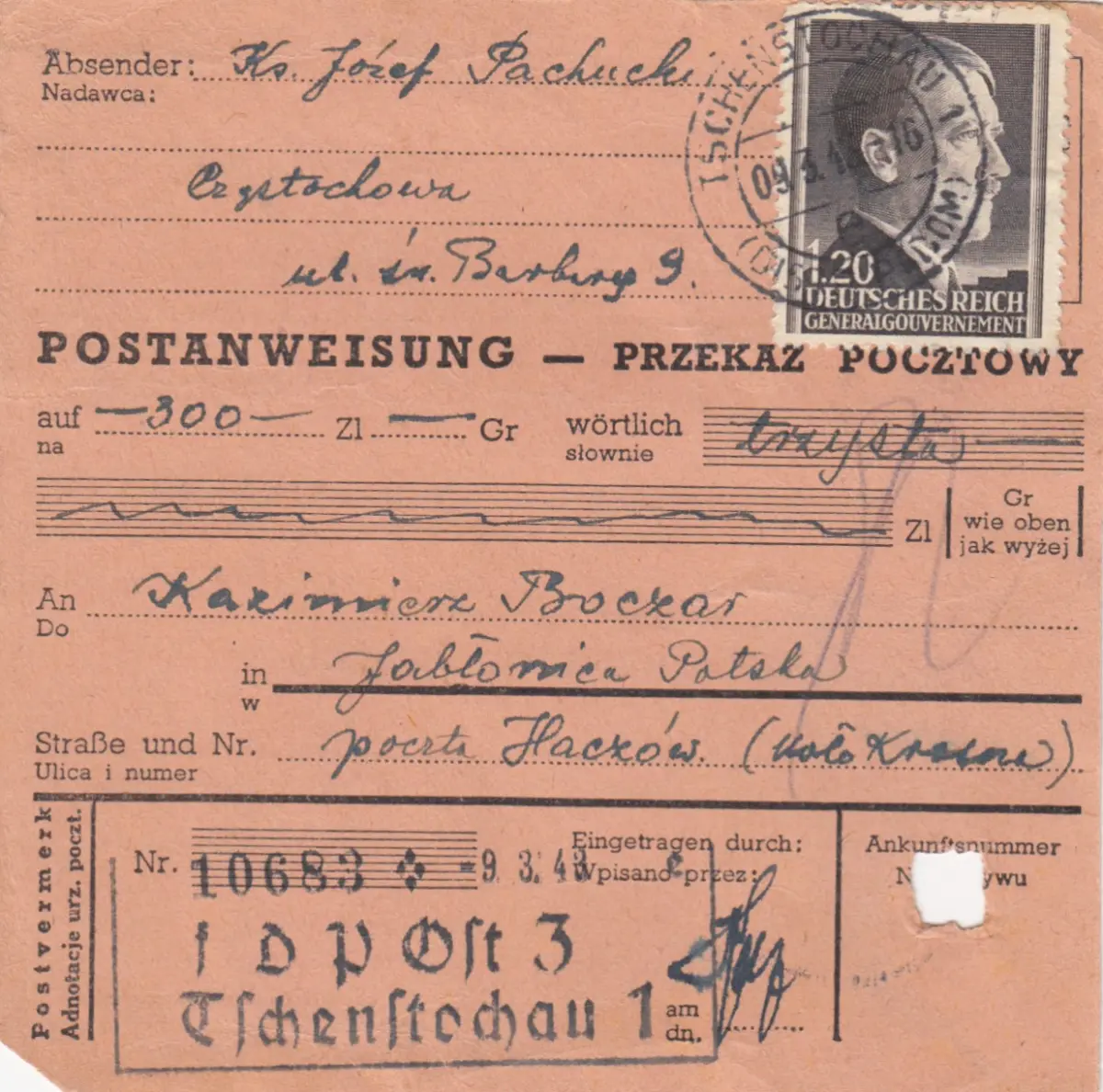 GG Postanweisung Tschenstochau Krosno, DP Ost 3, MiF portogerecht