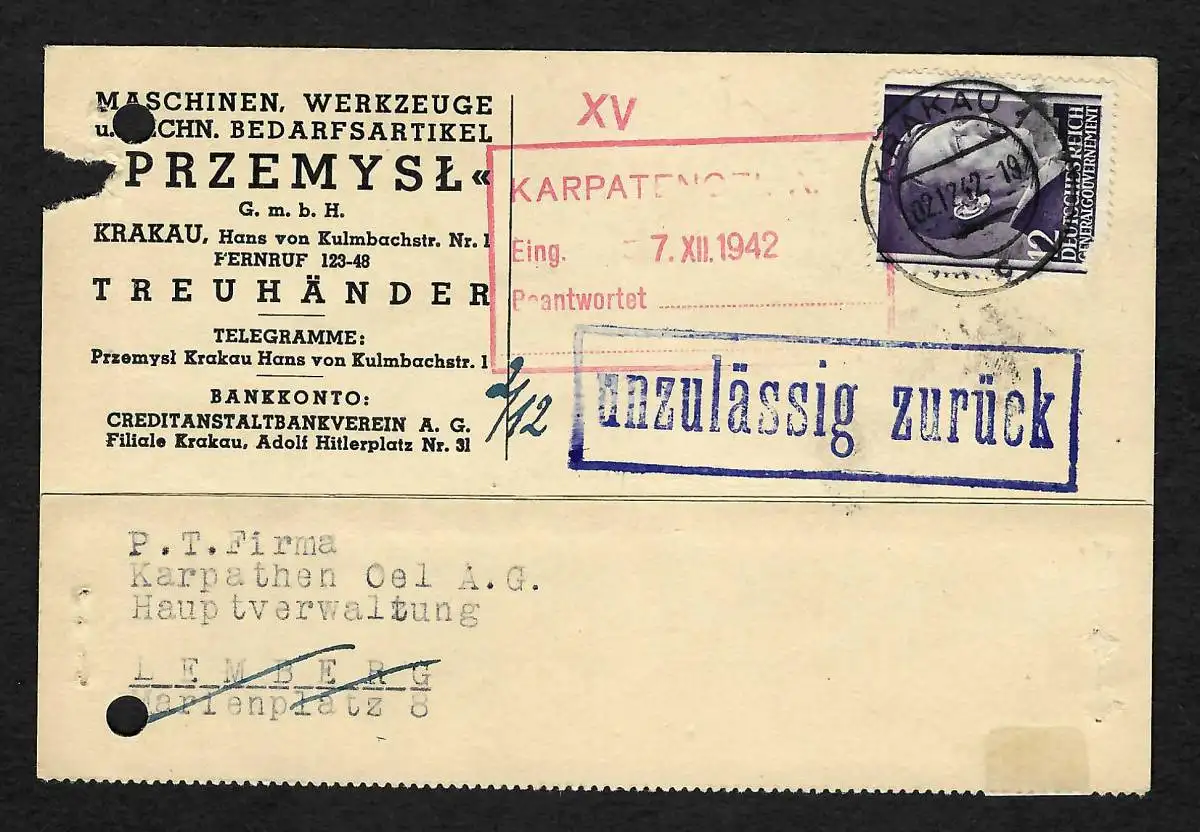 GG: Postkarte Przemysl nach Lemberg 1942: Unzulässig zurück