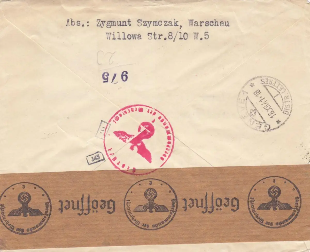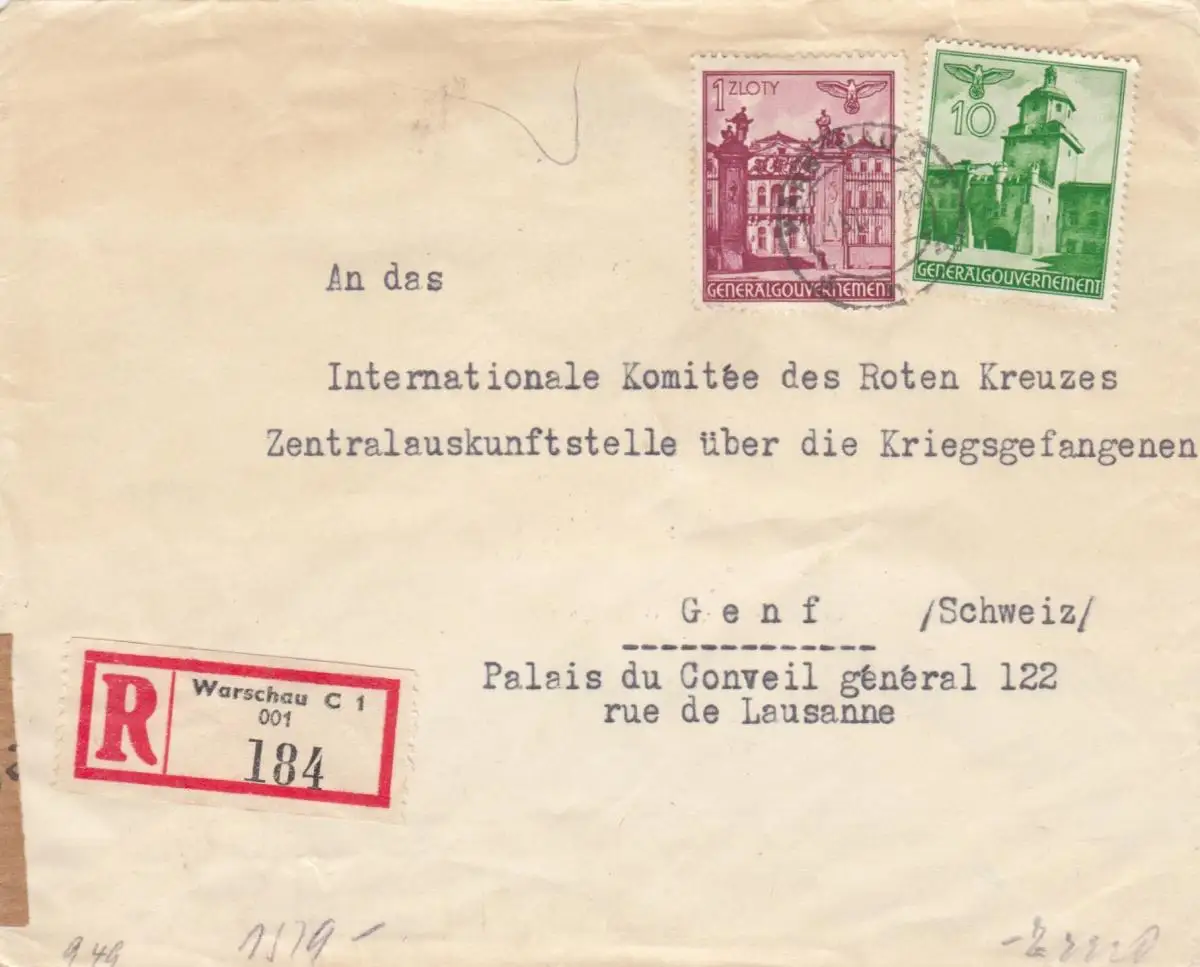 GG Schweiz: Einschreiben Warschau an Rotes Kreuz Genf, Zensur