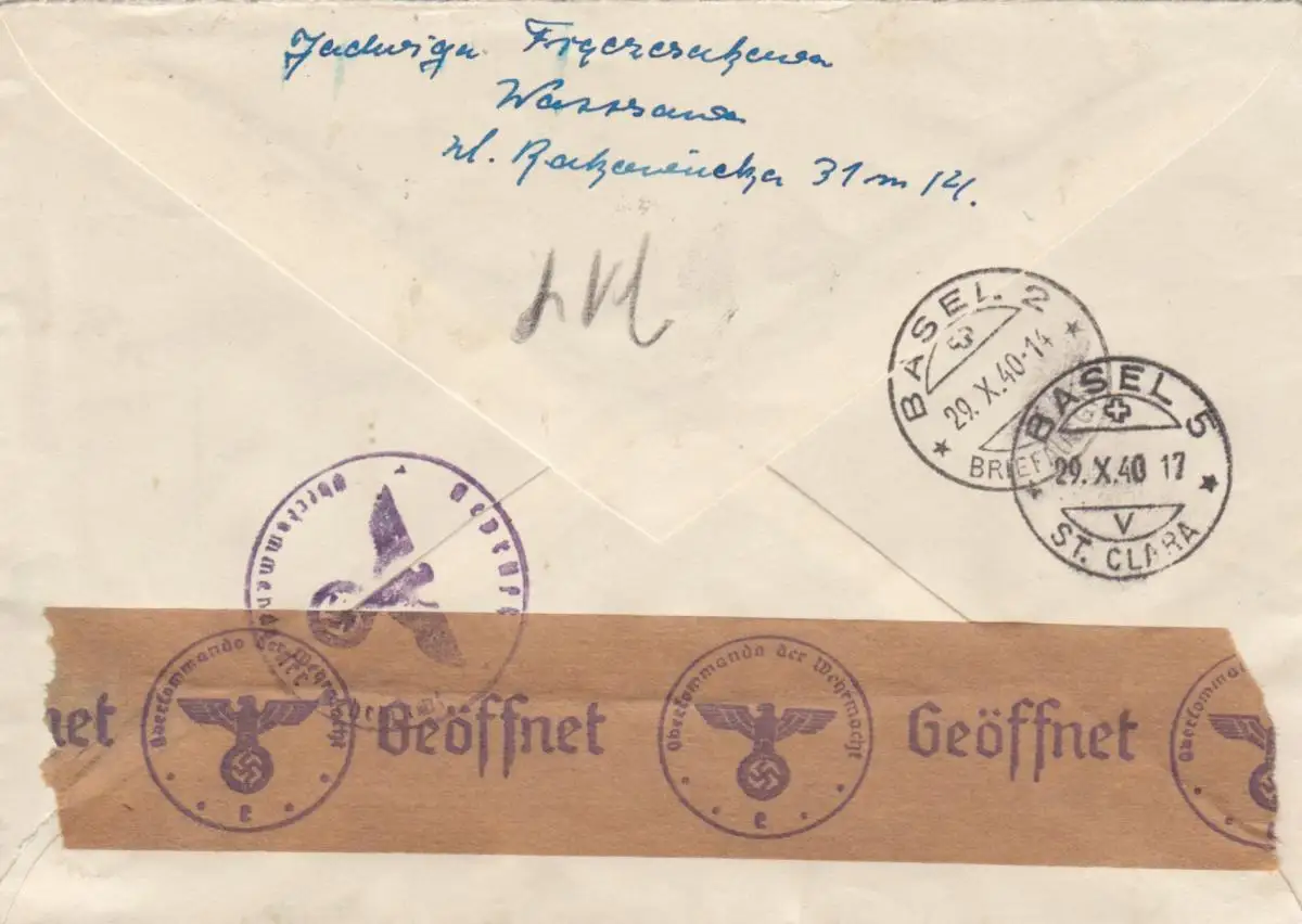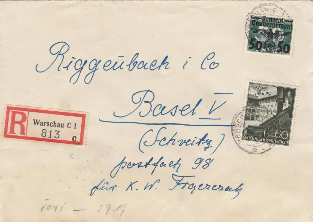 GG Schweiz Einschreiben Warschau, seltene Frankatur nach Basel, Zensur