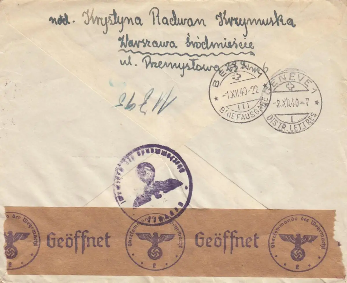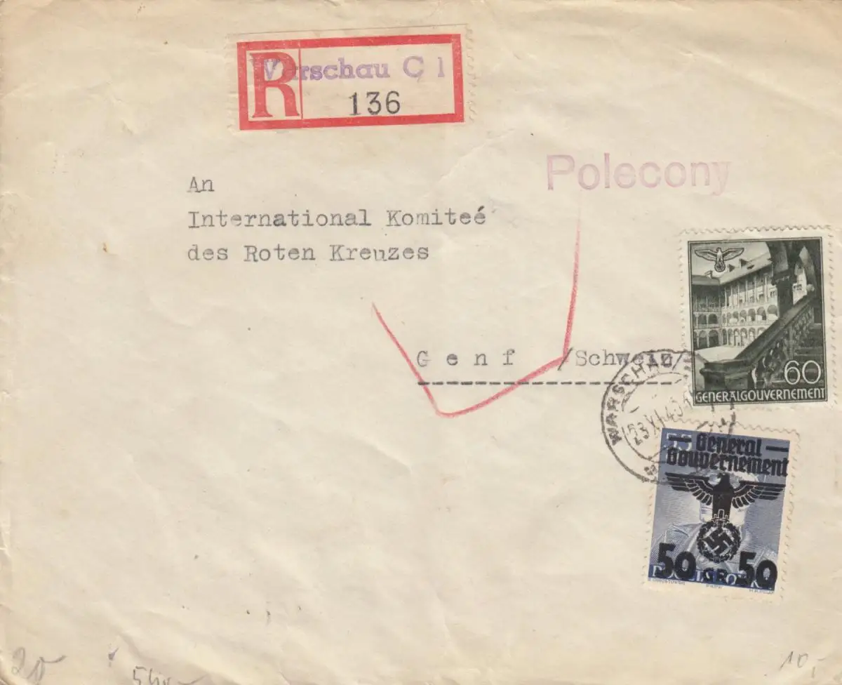 GG Schweiz: Einschreiben Zensur Warschau an Rotes Kreuz Genf