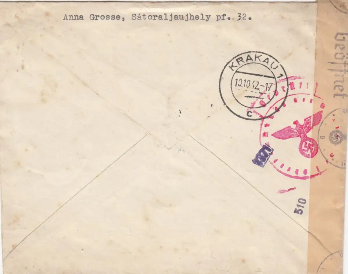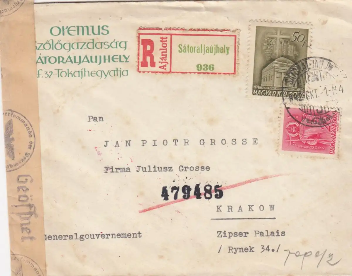 GG Ungarn: Einschreiben Satoraljaujhely nach Krakau, Zensur