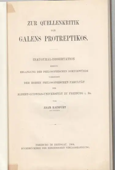Galenus / Galenos / Galen. - Adam Rainfurt: Zur Quellenkritik von Galens Protreptikos. Inauguraldissertation behufs Erlangung der philosophischen Doktorwürde vorgelegt der hohen philosophischen Fakultät der Albert-Ludwigs-Universität zu Freiburg i. Br. vo