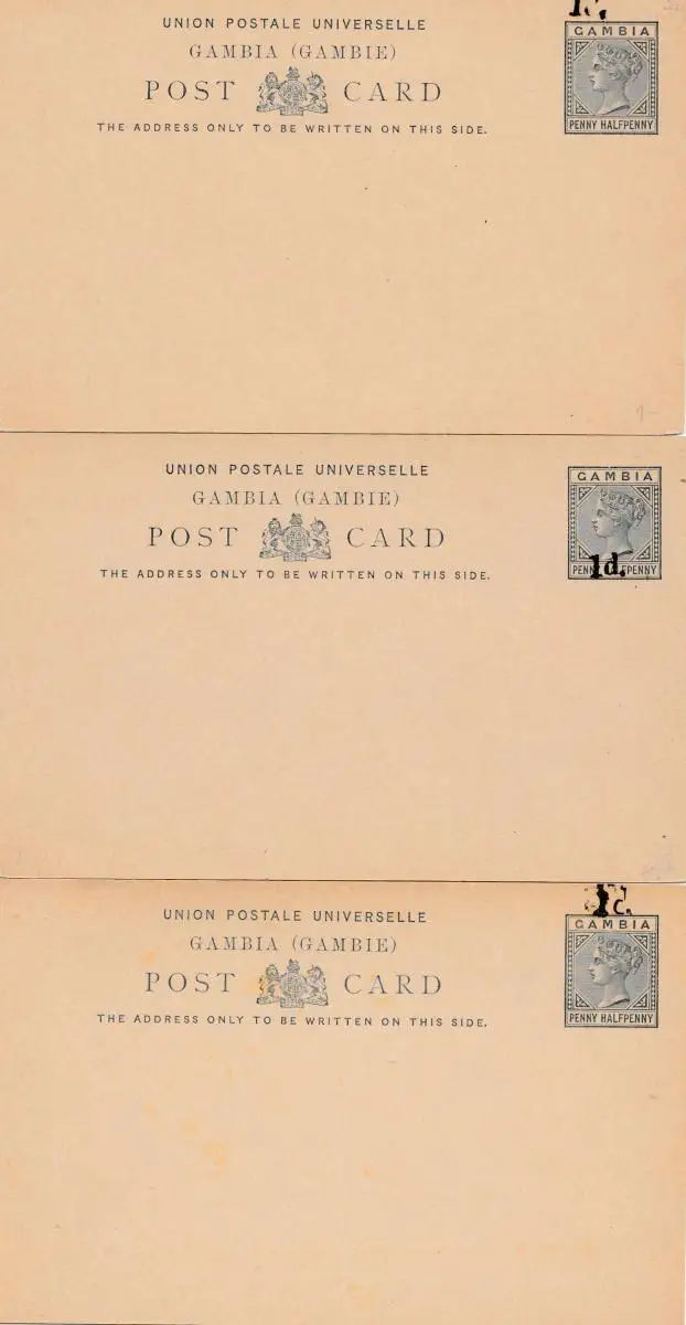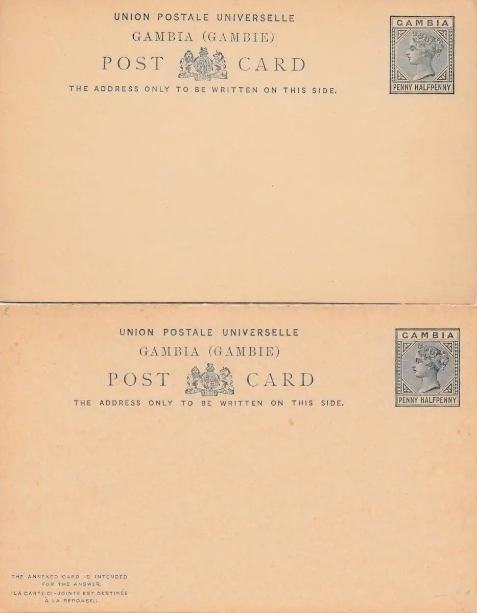 Gambia: postcard unused 5x, 1x overprint double, 1x with reply card (last one)