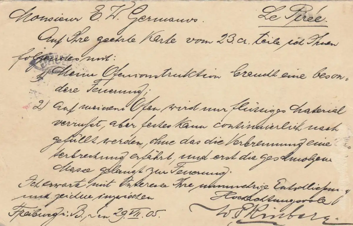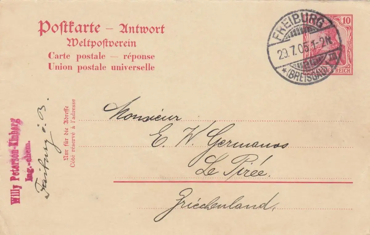 Ganzsache Freiburg 1905 nach Le Pirée, Griechenland