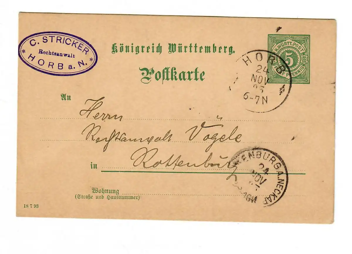 Ganzsache Horb 1893 nach Rottenburg/N
