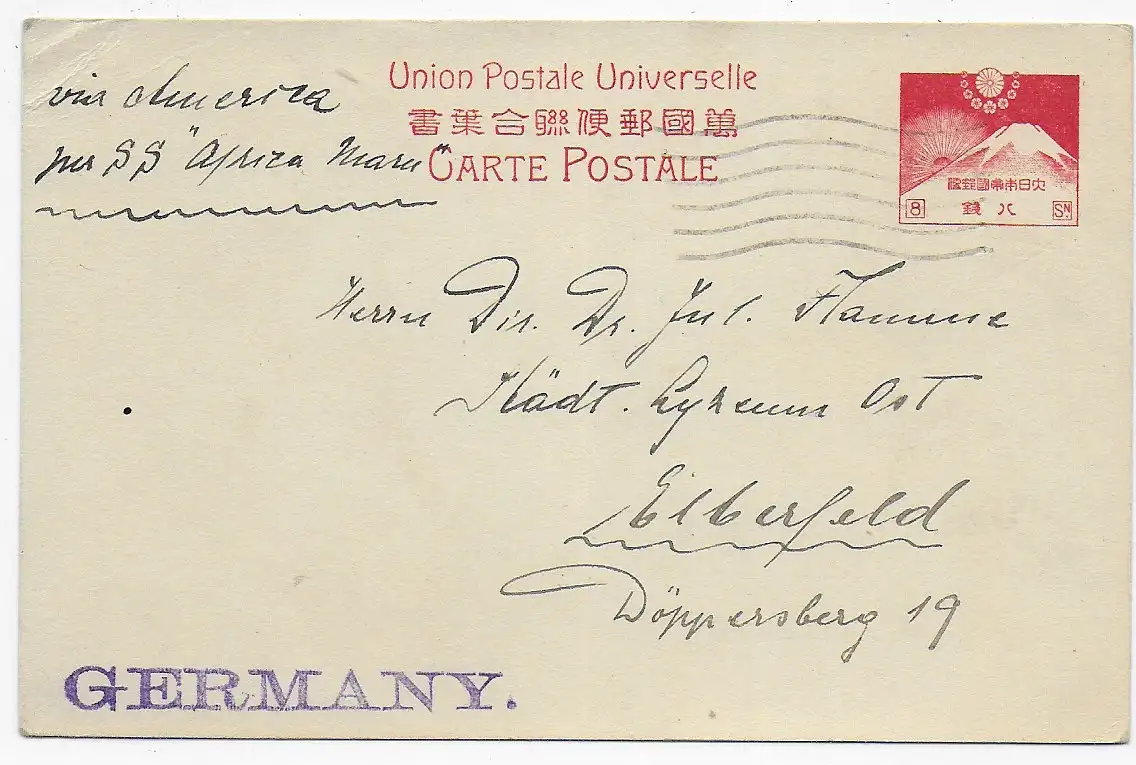 Ganzsache Japan via SS Africa Masu nach Elberfeld 1923